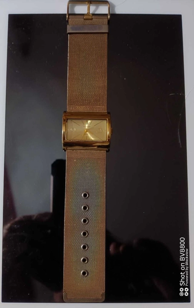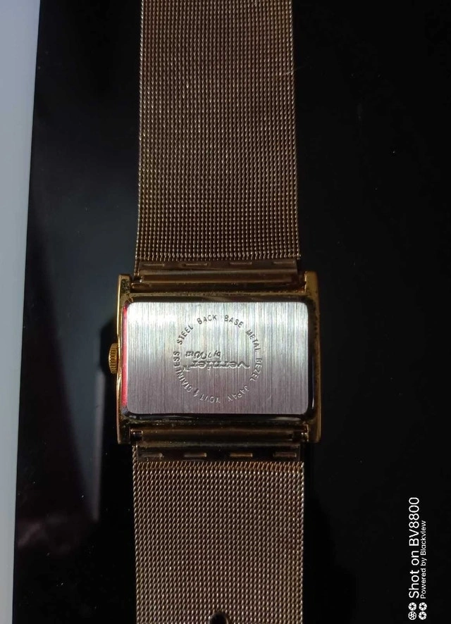 This is a used Vernier watch with a gold rectangle face and gold mesh band. It's a stylish timepiece that adds a touch of elegance to any outfit. Specifications: * Brand: Vernier * Type: Wristwatch * Display: Analog * Band Material: Metal Mesh This watch is looking for a new home! If you see this ad, it's still available, so don't hesitate to reach out!