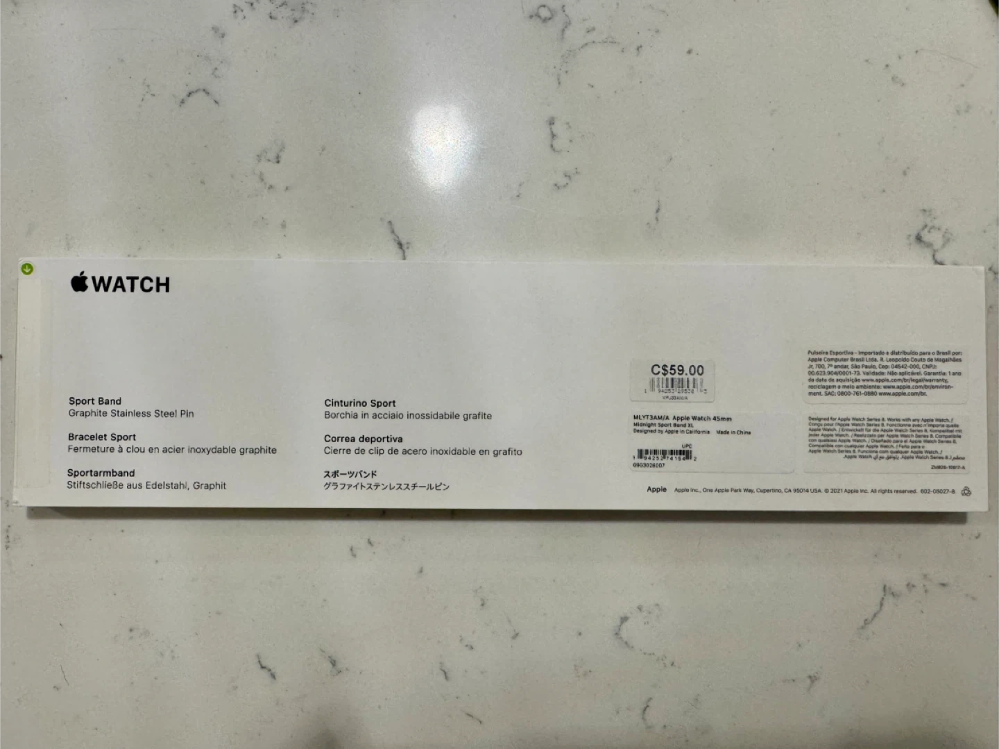 Brand new never used Sport Band XL, for Apple Watch, size 45mm. Still sealed in the original box. Color Midnight. Genuine product from Apple Store.
