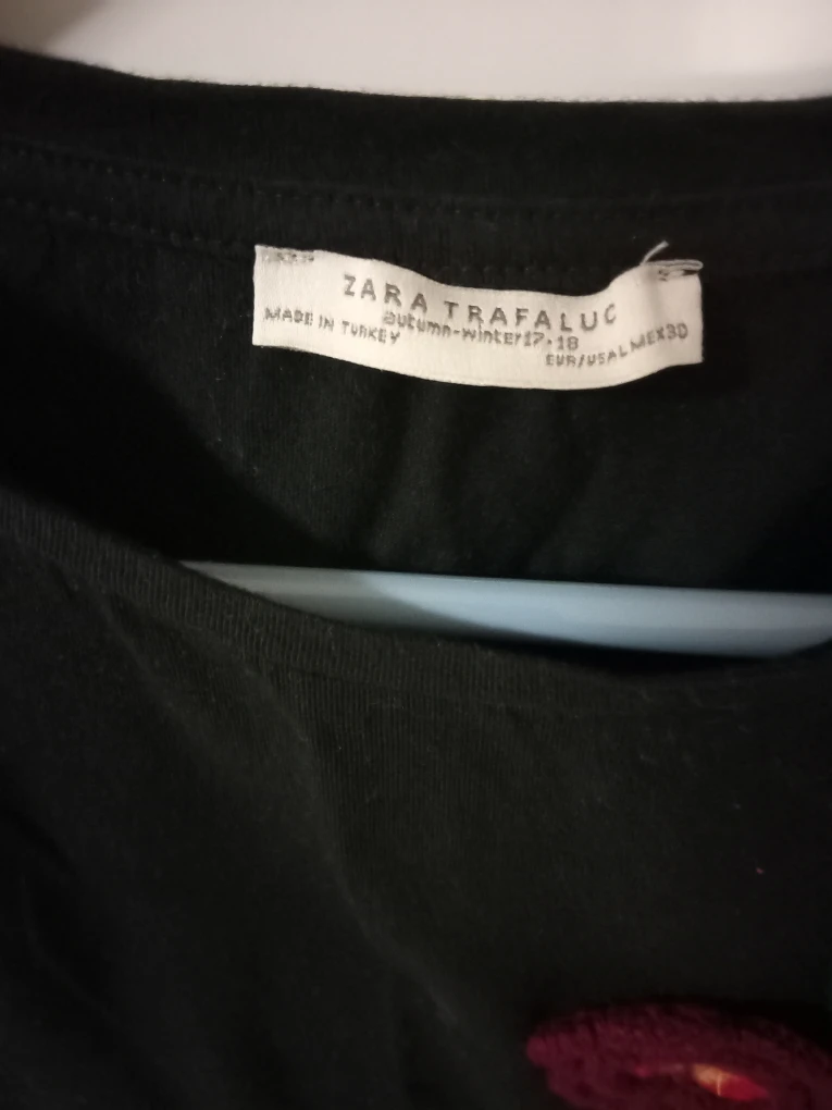 This is a Zara Trafaluc black T-shirt with a floral design. It's in great condition and is a size MEX30, which is equivalent to EUR/USA size large. It's perfect for autumn or winter!