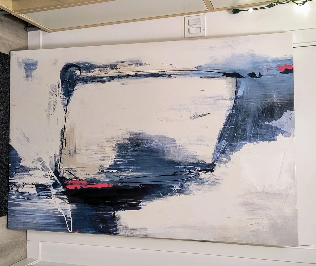 Here's a beautiful abstract wall painting (60" X 40") that could really brighten up a room! It features a mix of white, blue, and black tones, with a touch of red. It's in great condition and ready to hang.
