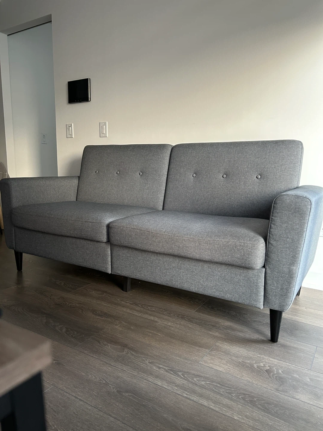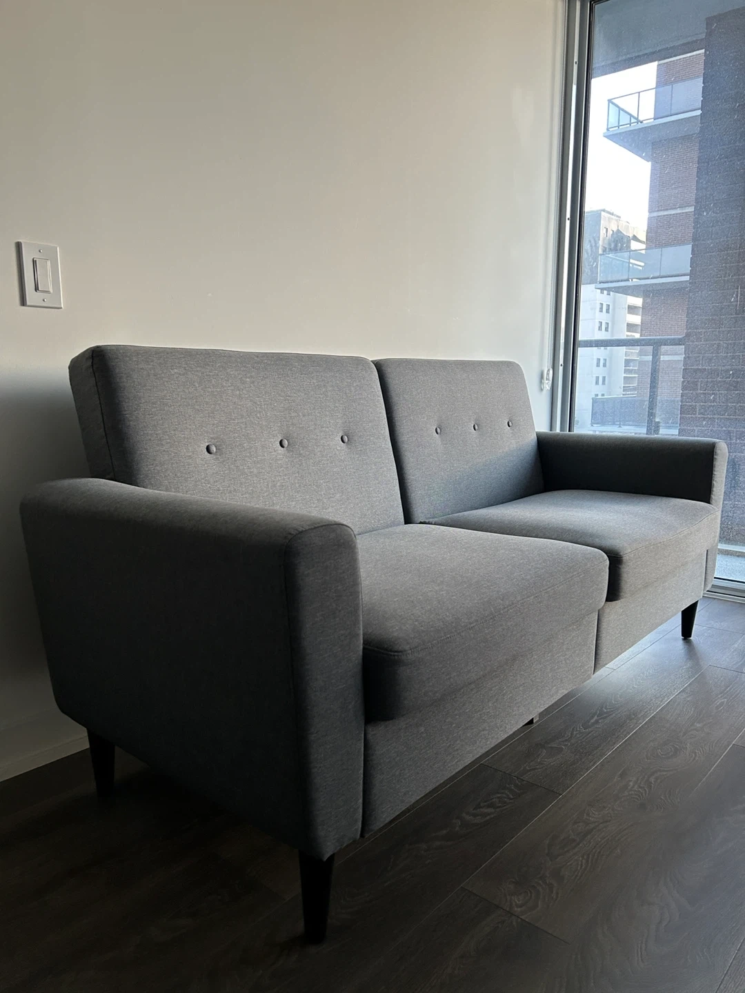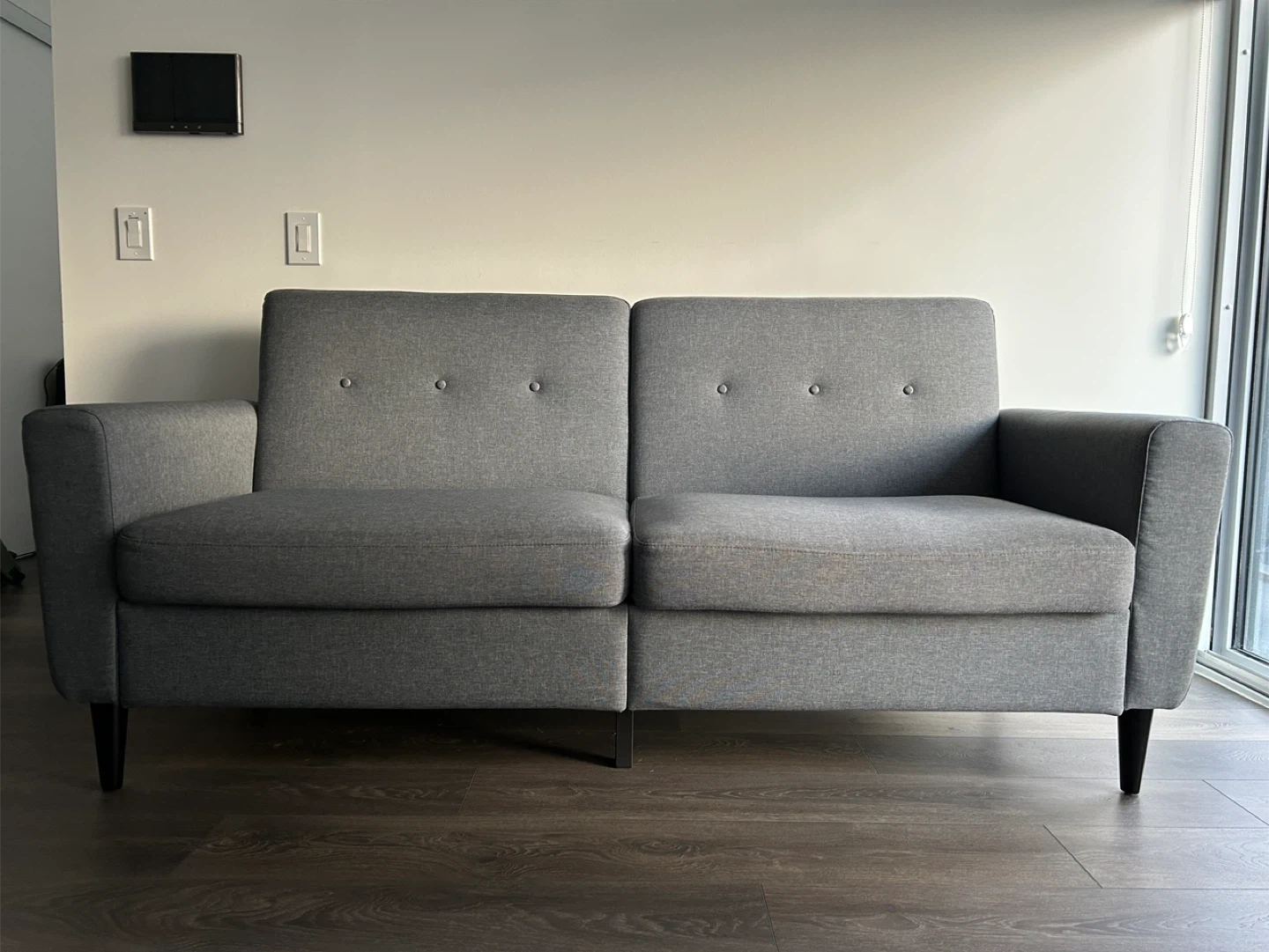 This three-seater couch is great for fitting into compact spaces and is spacious enough to relax with family and friends. Its soft linen-touch fabric, thick padded seat, and ribbed internal frame offer exceptional comfort. Meanwhile, its linen-touch surface, button-tufted back, and black wood legs evoke elegance.