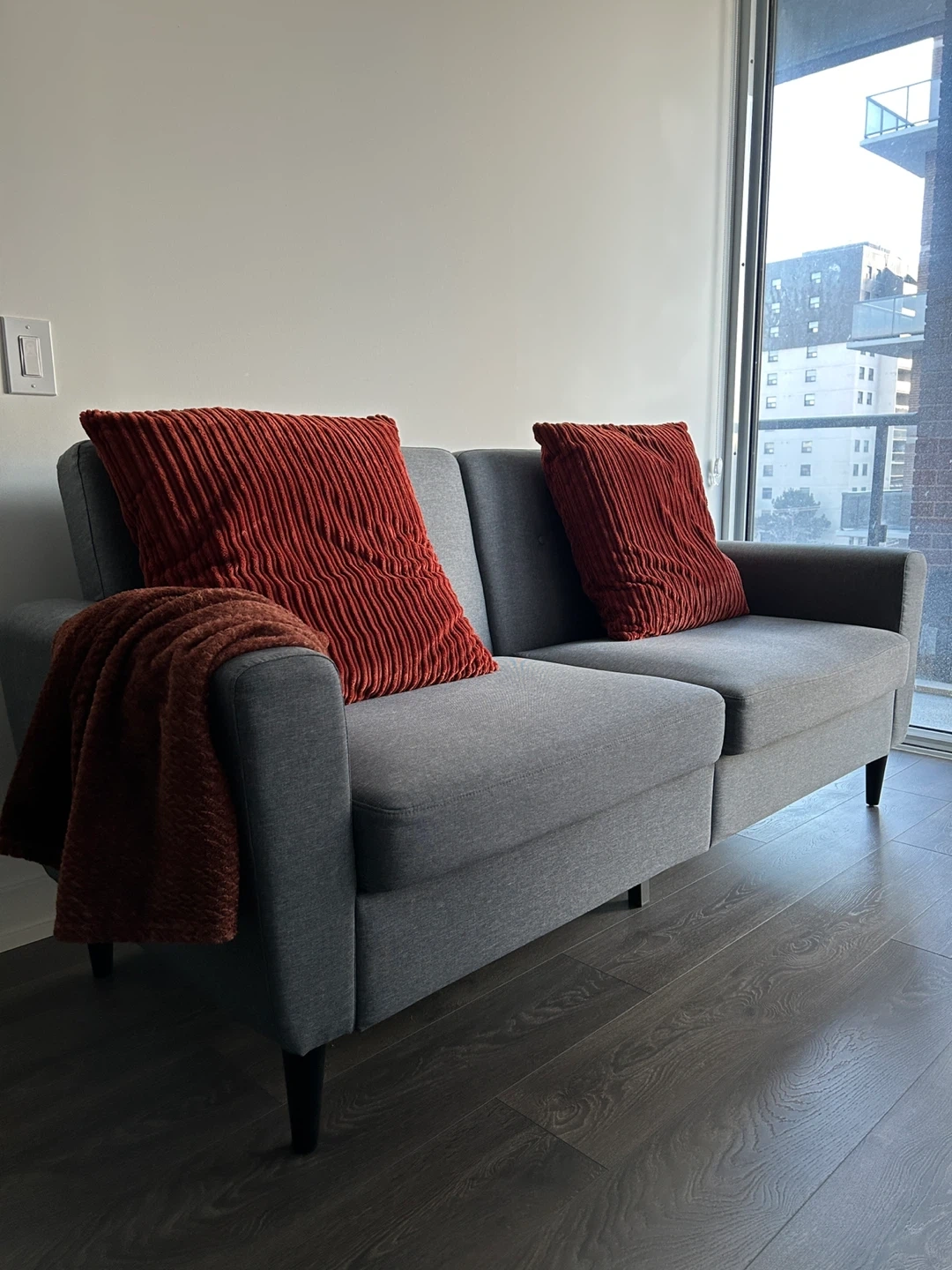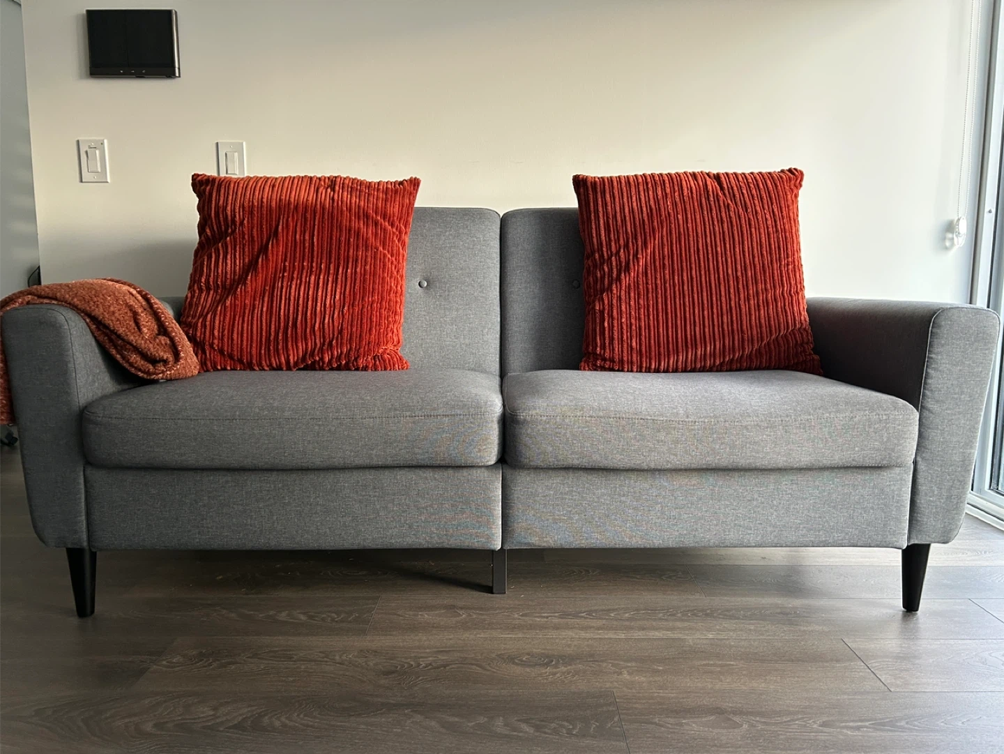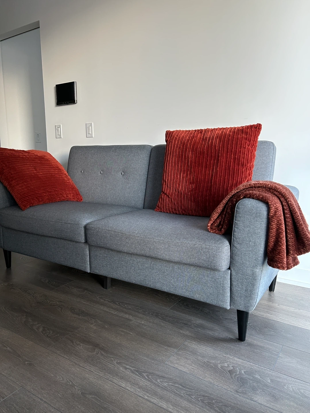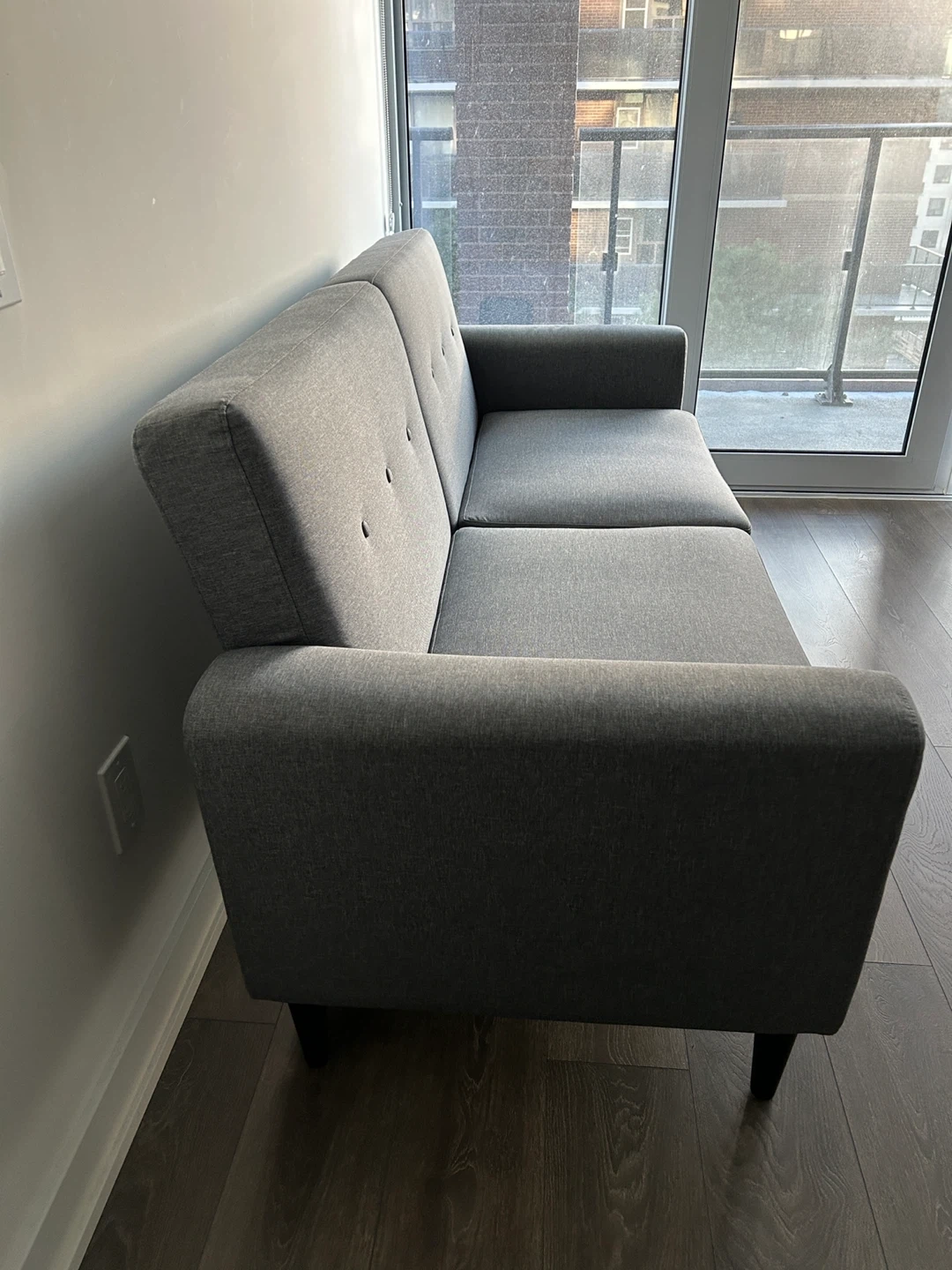 This three-seater couch is great for fitting into compact spaces and is spacious enough to relax with family and friends. Its soft linen-touch fabric, thick padded seat, and ribbed internal frame offer exceptional comfort. Meanwhile, its linen-touch surface, button-tufted back, and black wood legs evoke elegance.