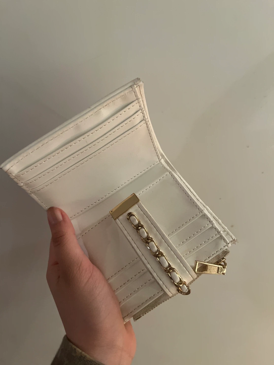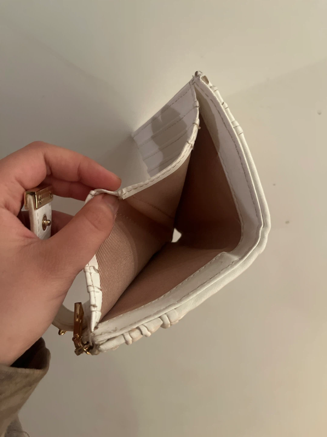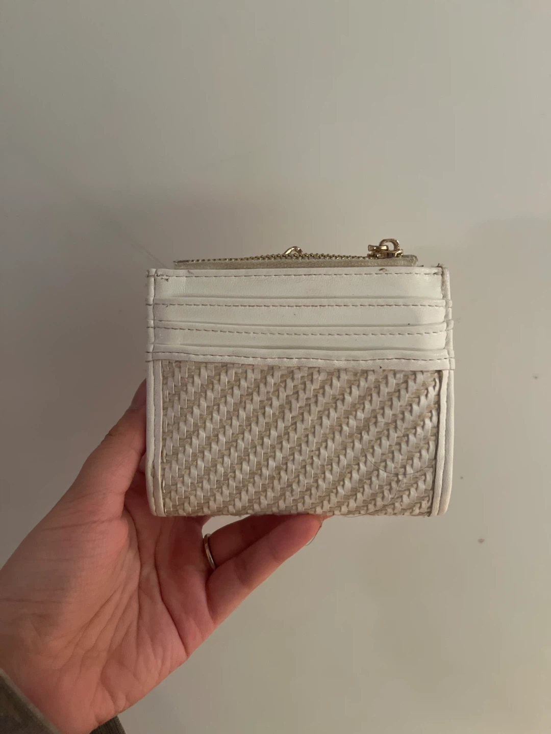 Selling a cute white wallet with a woven texture! It's a smaller size, perfect for carrying just the essentials. It features a zippered compartment and slots for cards. Great for everyday use!