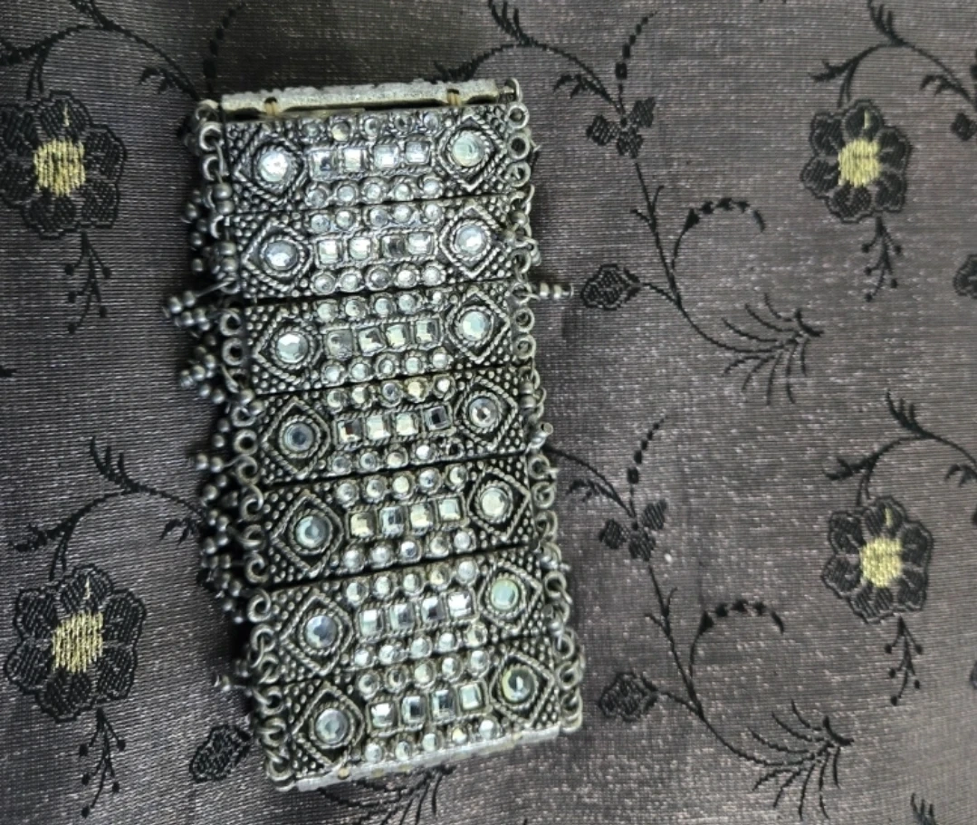Selling a vintage silver-tone bracelet with rhinestone detailing! It has a unique, eye-catching design and is perfect for adding a touch of sparkle to any outfit. It's in good condition and ready to be worn and enjoyed