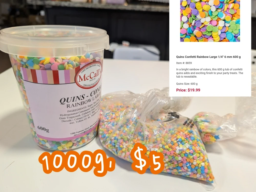 Selling a large quantity of Quins Confetti Rainbow sprinkles! The tub is resealable, great for adding a fun touch to your party treats or baked goods. You'll get 1000g of these colourful quins, originally 600g bought for $19.99.