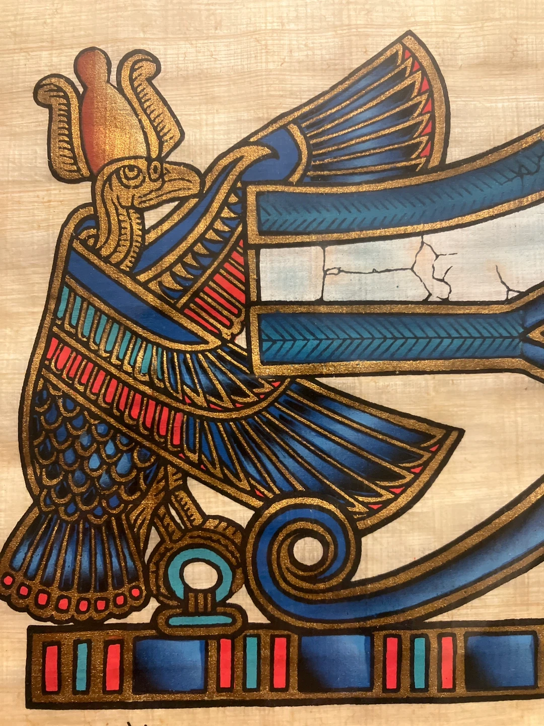 Selling a beautiful Egyptian papyrus painting! It features vibrant blues, reds, and gold details. A unique piece of art for your home. Mystical and spiritual symbol for lovers of the ancient world.