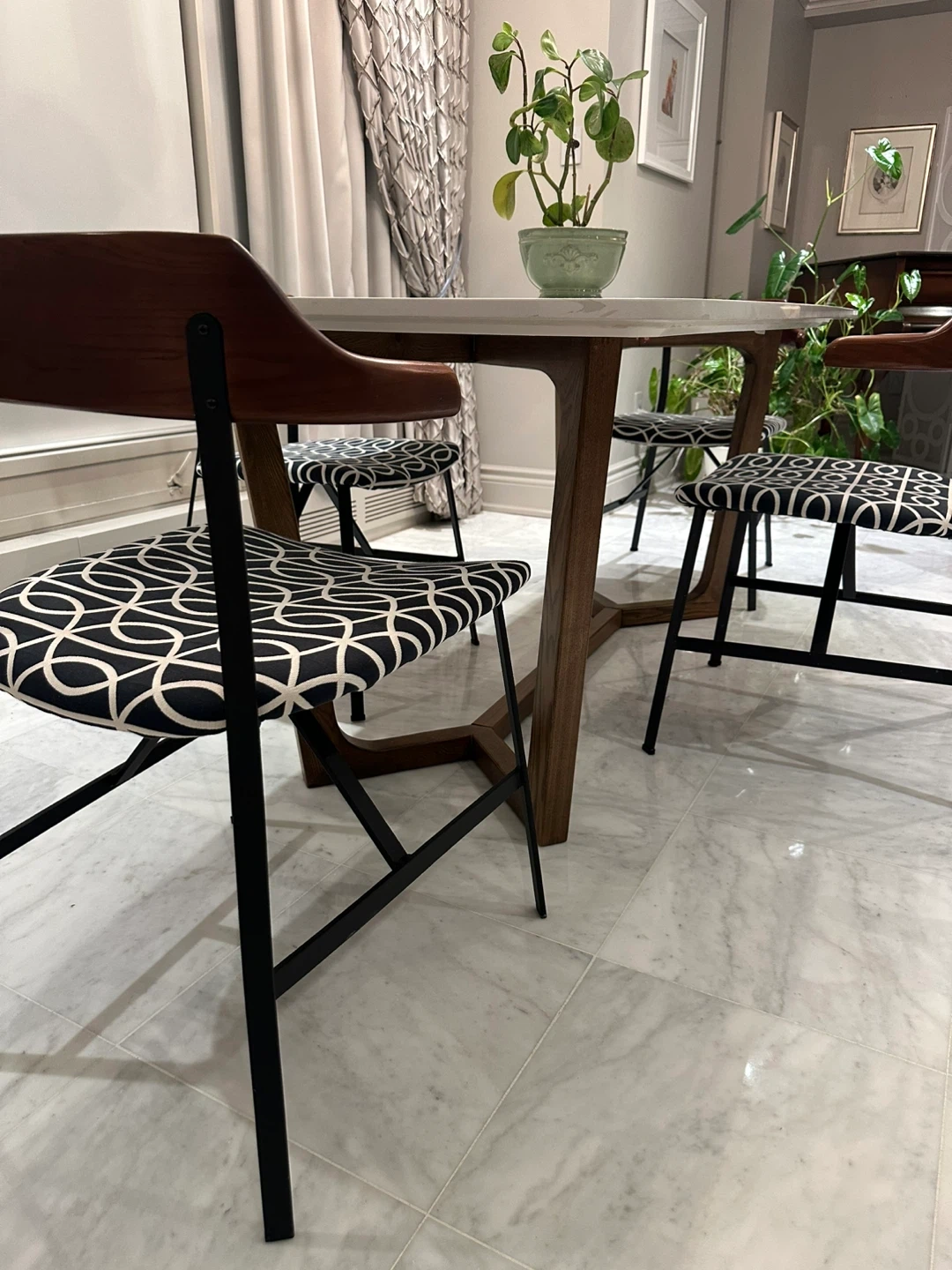 Elevate your dining space with this elegant, and much beloved, dining table set, complete with a sleek white faux-marble top and modern wooden and wrought iron chairs. This set comfortably seats six. It has been lovingly cared for and has experienced lively, fun dinner parties and company meetings. It is in excellent condition.