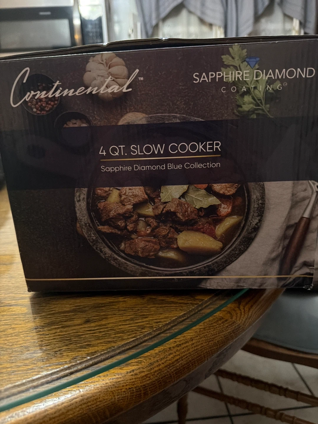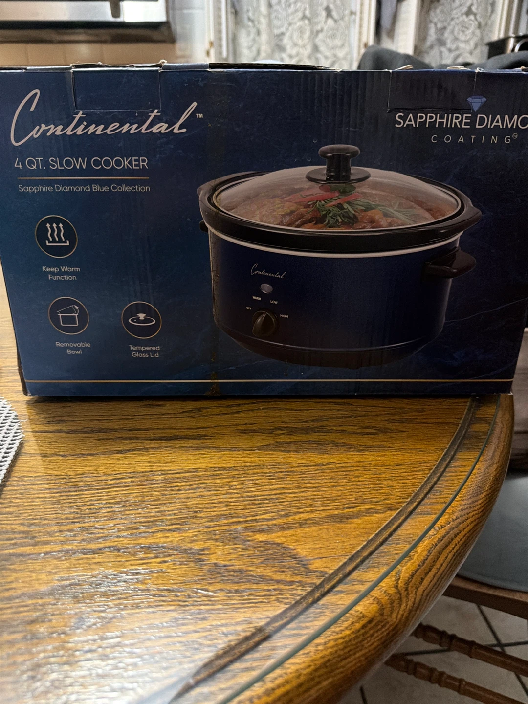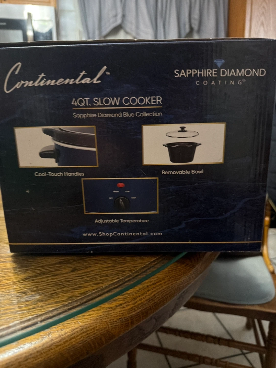 Selling a brand new Continental 4 Qt. Slow Cooker. It's still in the box and has never been used! This slow cooker features a Sapphire Diamond Blue Collection coating, a removable bowl, and a tempered glass lid. It also has cool-touch handles and adjustable temperature settings. Perfect for easy and delicious meals!