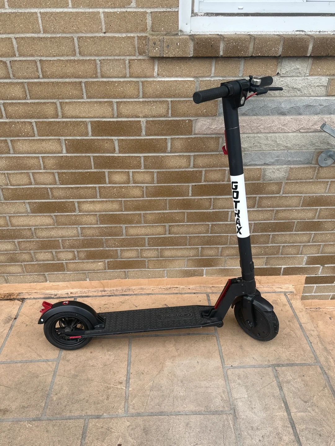 This is a GOTRAX electric scooter. It's black with red accents. Features a durable deck and rear fender brake.