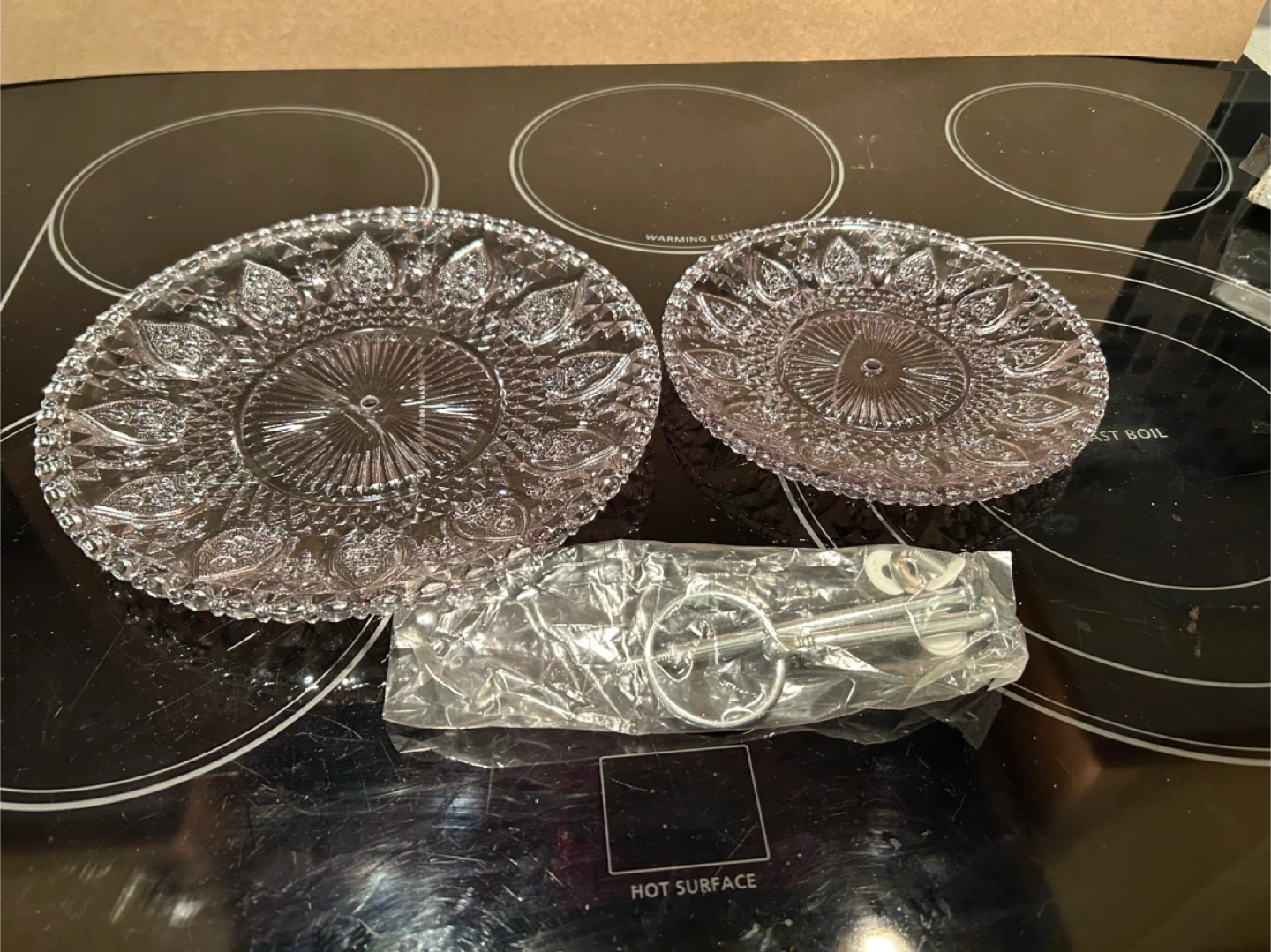Selling a two-tiered serving stand with two clear glass plates and the hardware to assemble it. Great for displaying desserts or appetizers!