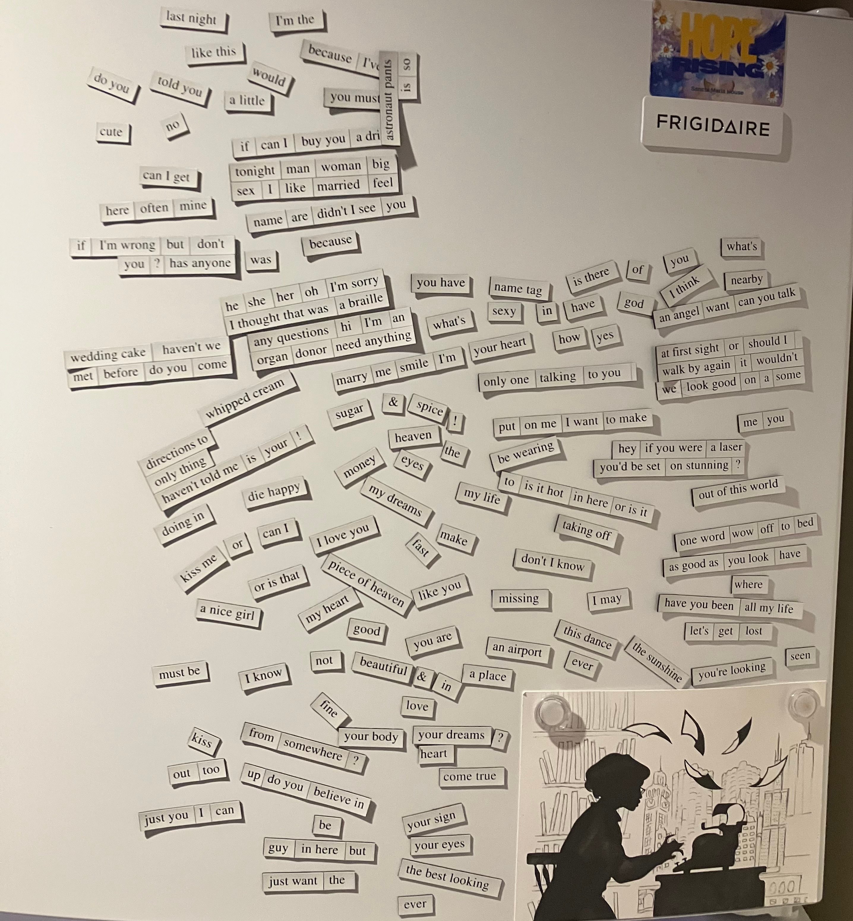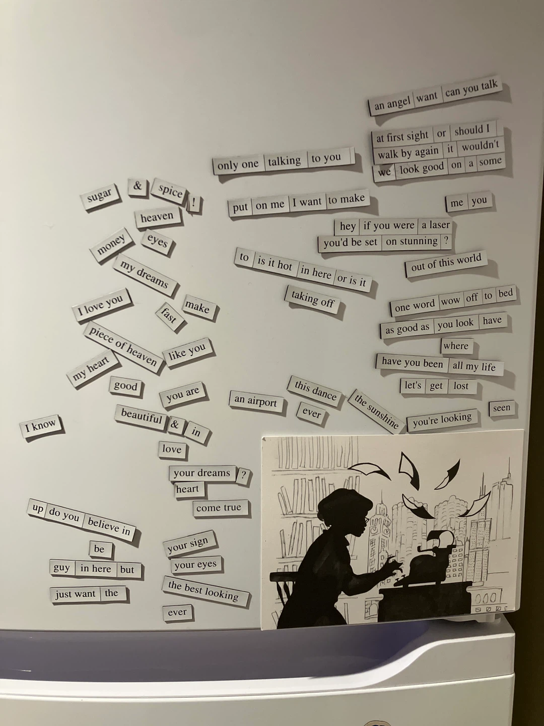 Selling a set of fridge magnet words and a piece of art. The magnets are great for creating fun messages on your fridge! The art adds a nice touch to your kitchen decor.
