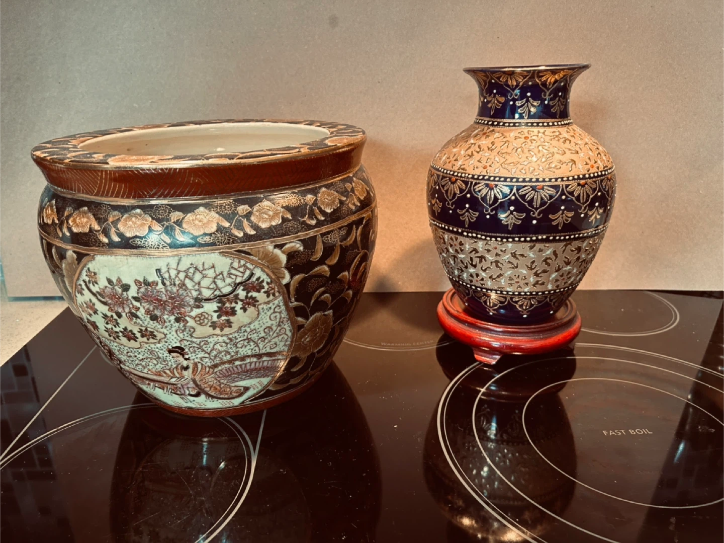 Selling a decorative vases. The vase is a dark blue with gold and silver designs, sitting on a red wooden base. The short vase is a larger, round piece with similar floral and bird motifs in reds, golds, and blacks. They would make a lovely addition to any room!