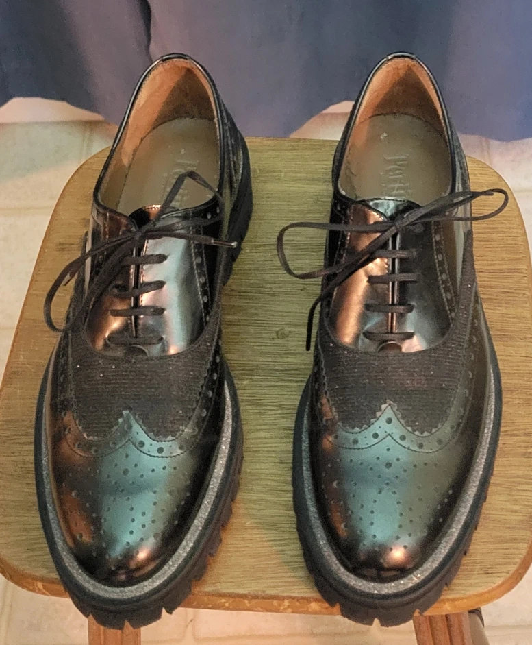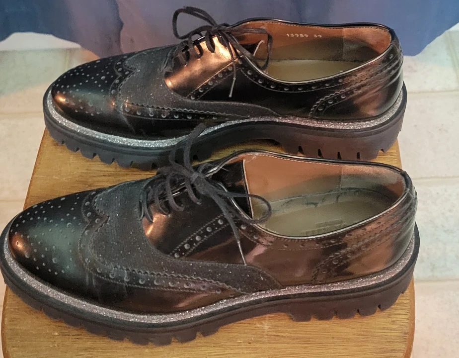 Selling a pair of Brand New Pertini Women's black oxford shoes. Size 8. These PERTINI shoes come in a perforated patent leather featuring a silver glitter trim, rubber sole, and a lace up closure. Made in Spain. Stylish and Comfortable!