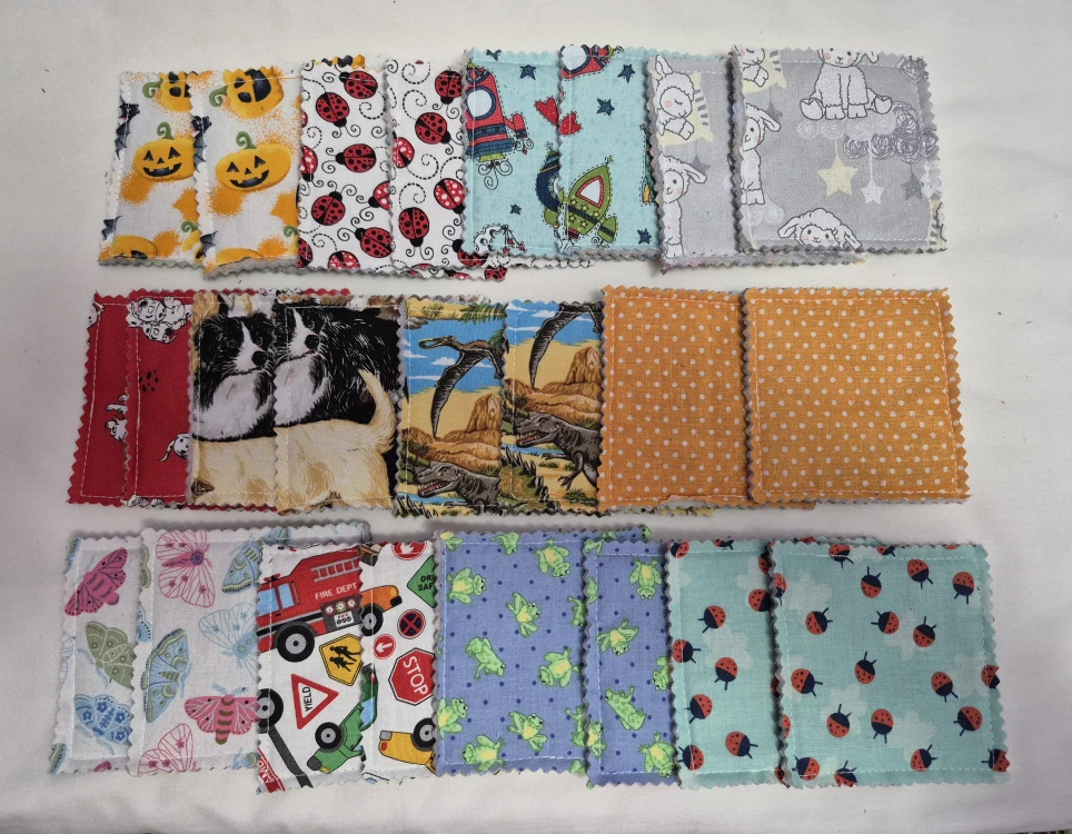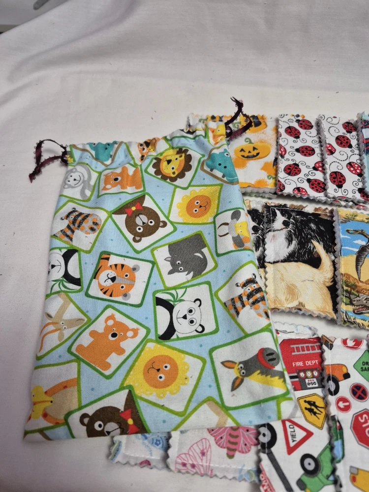 I'm selling a collection of handmade fabric squares with various fun patterns, including Batman, Mario, Spiderman, and more! They come with a cute drawstring bag featuring animal designs. Perfect for young children to help train and develop concentration.