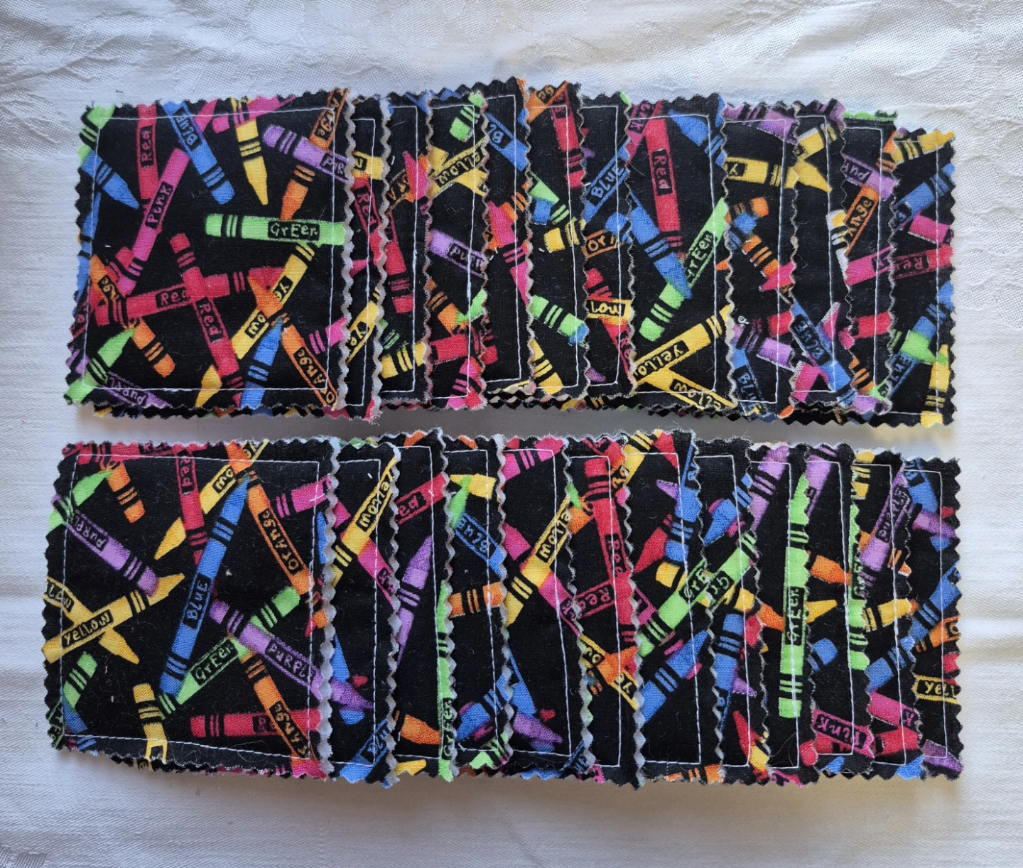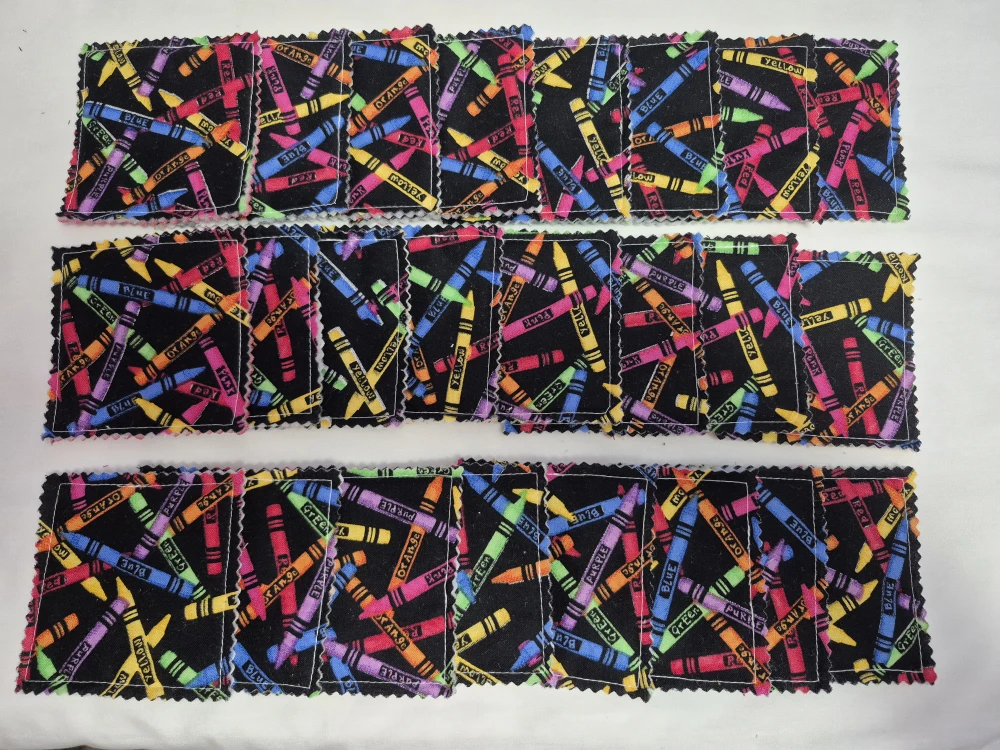 Fabric pieces with no sharp edges, washable and it has its only storage bag. Each bag holds 12 sets, 24 pieces. 100 % cotton, cards measure 3.5 in x 3.5in, bag measures 6in x 10in. Same print on one side and 2 of each print on other side.