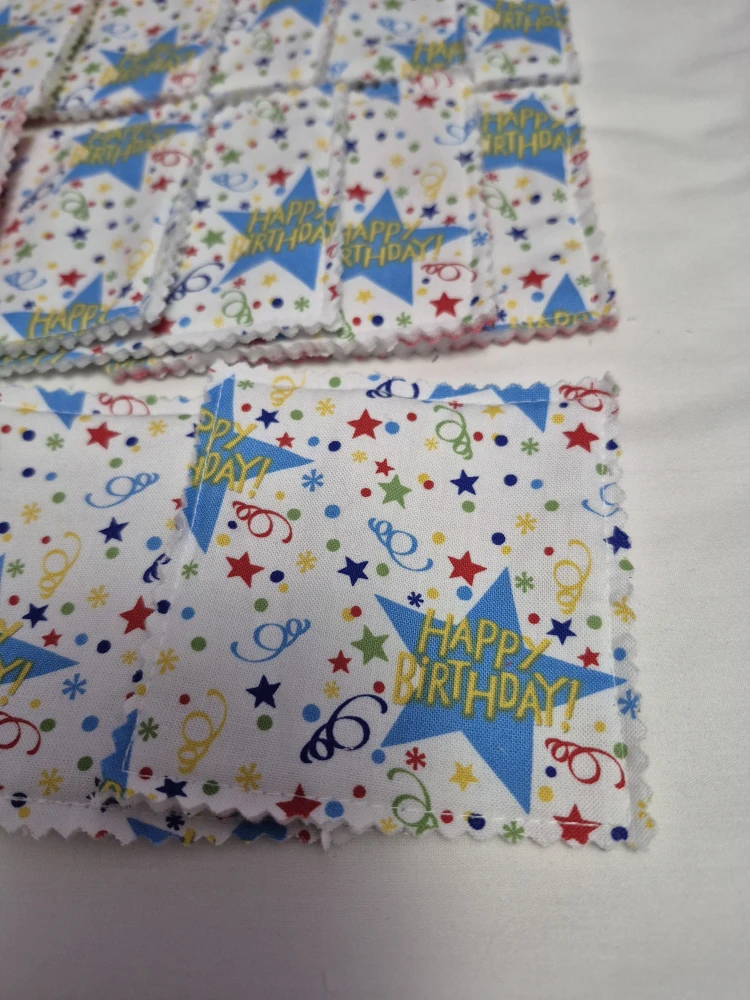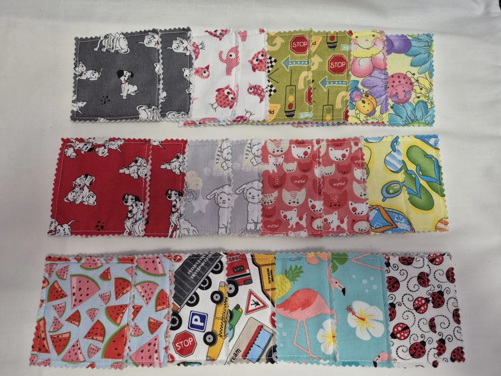Fabric pieces with no sharp edges, washable and it has its only storage bag. Each bag holds 12 sets, 24 pieces. 100 % cotton, cards measure 3.5 in x 3.5in, bag measures 6in x 10in. Same print on one side and 2 of each print on other side.