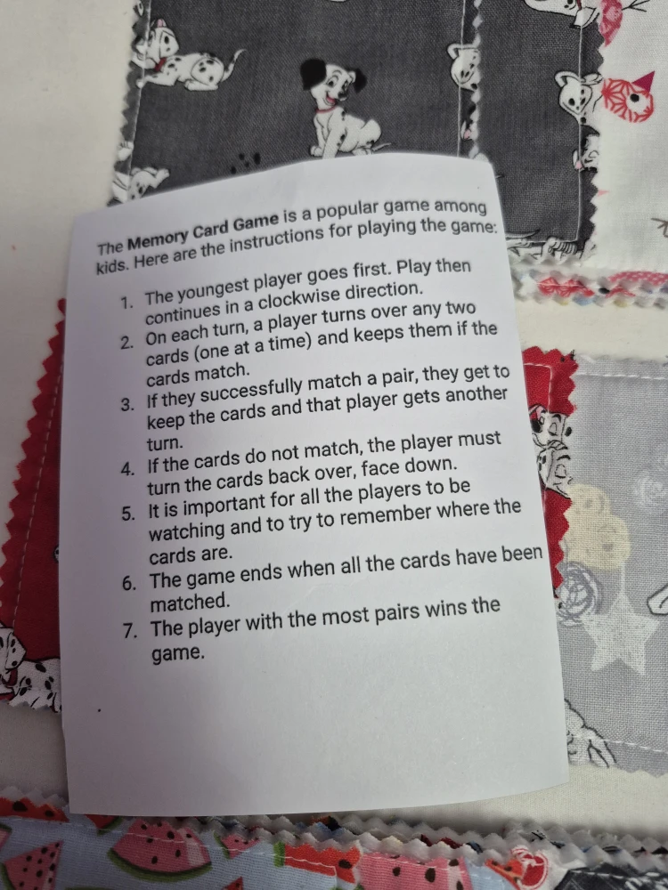 Selling a handmade memory card game for kids! It comes with a cute drawstring bag for storage and easy cleanup. The cards have different patterns and are great for developing memory skills. Perfect for young children to help train and develop concentration.