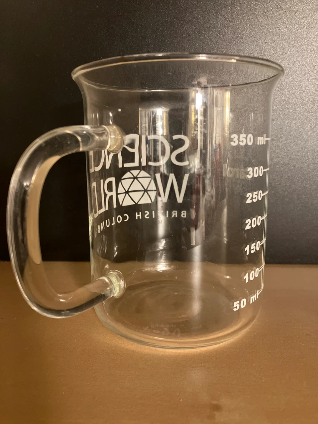 Science World British Columbia mug. It's a clear glass mug with the Science World logo on it. The mug also has stylized imprecise measurement markings on the side (for visual effect - they’re off by nearly 20%).