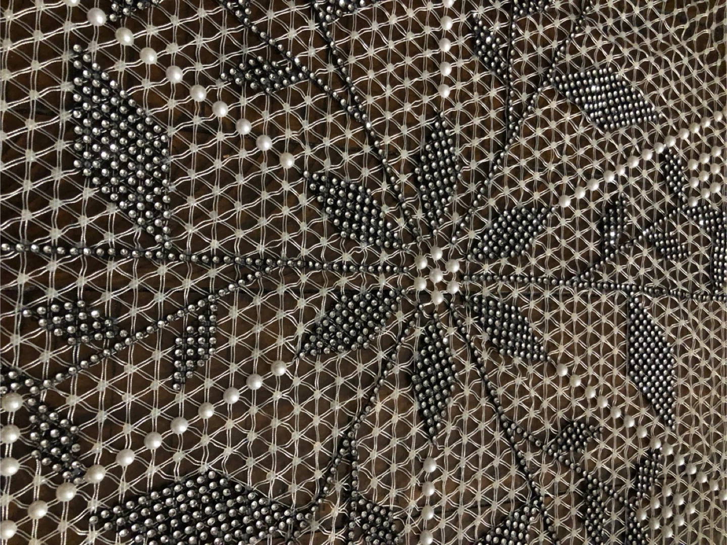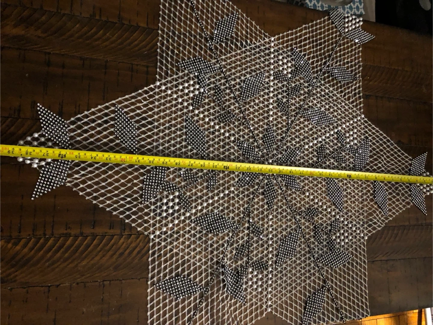 This is a brand new handmade beaded decorative snowflakes and star table runner. It is approximately 39 inches in size. It features a white net-like material with black and white snowflakes and star accents. It would make a great addition to your home decor