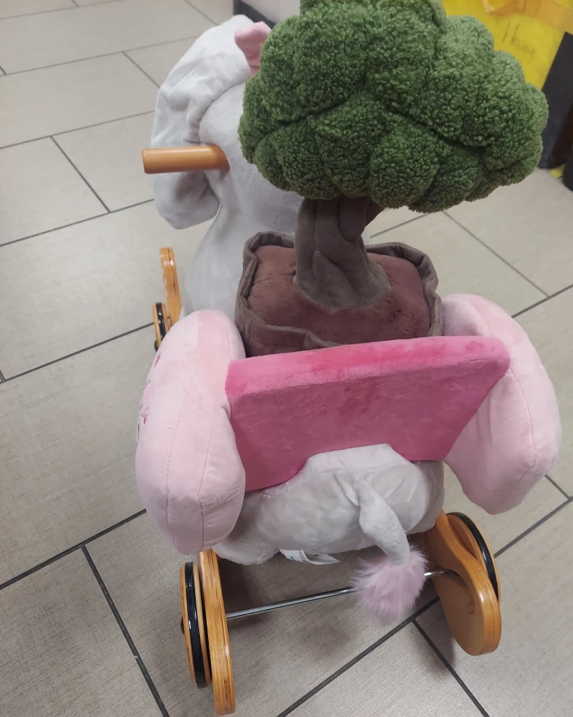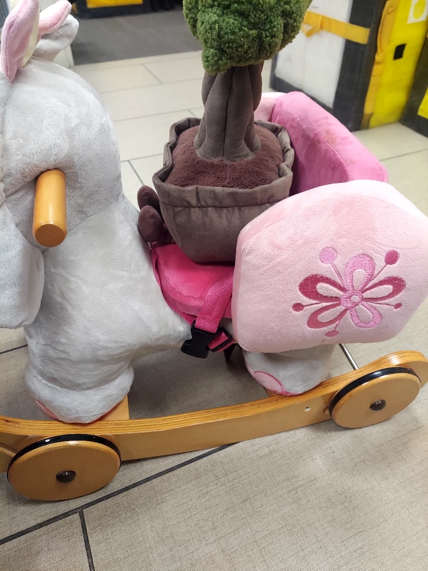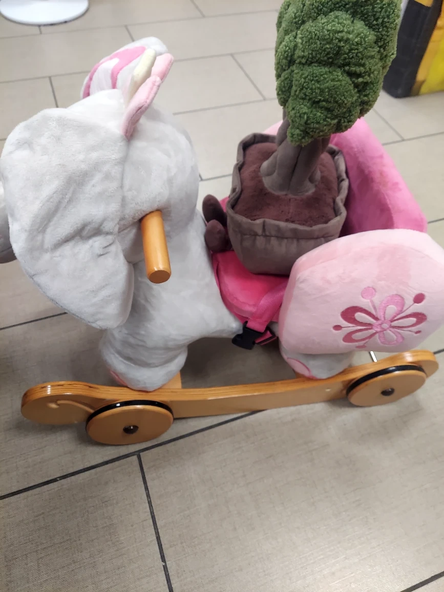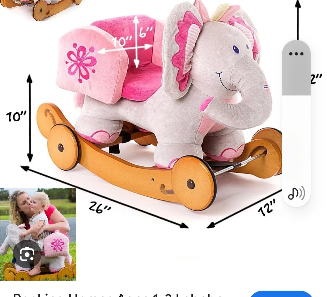 This is a Labebe Child Rocking Horse in an adorable elephant design! It features a soft, plush seat and a sturdy wooden base. The dimensions are approximately 26" long, 12" wide, and 10" high. The seat is about 10" x 6". It's perfect for little ones!