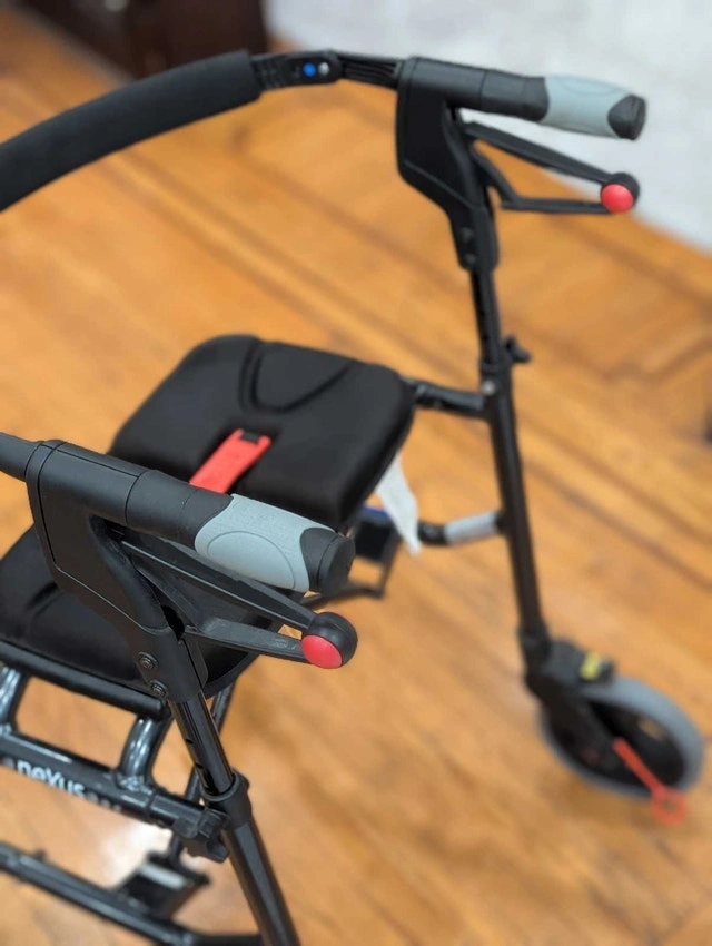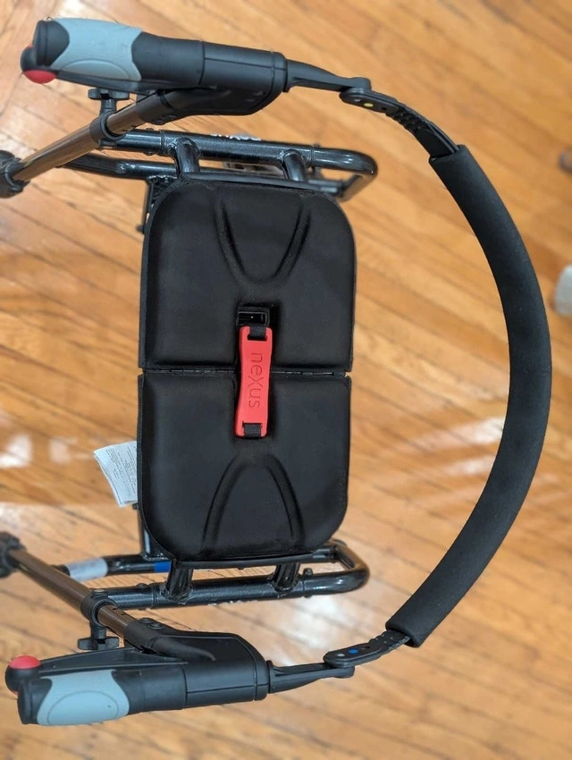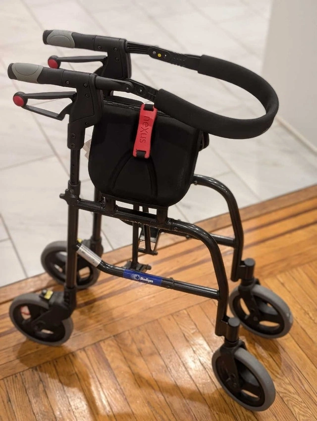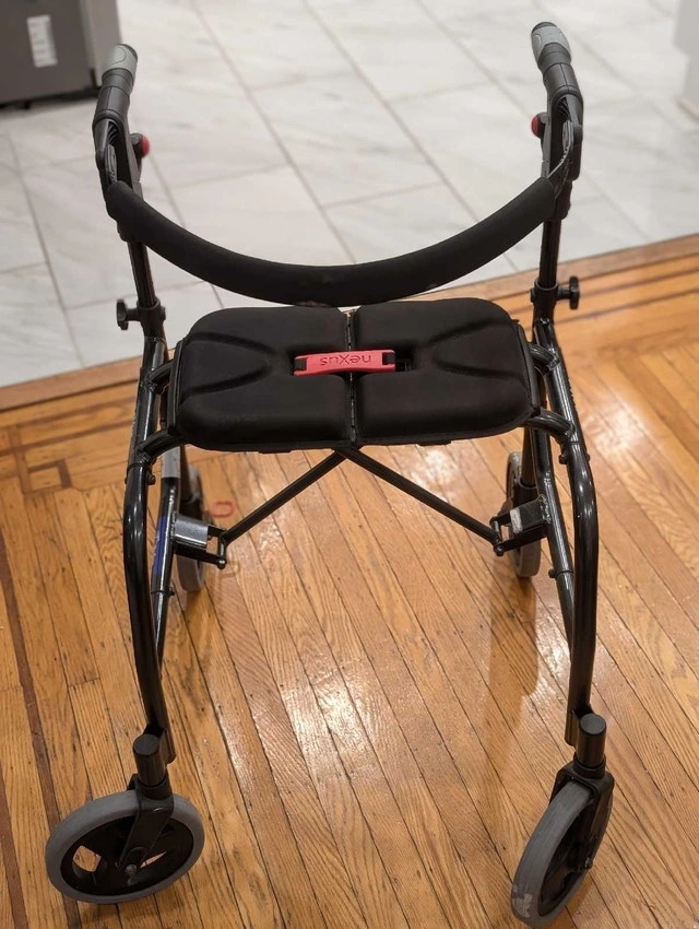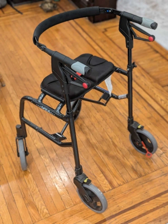 neXus 3 walker rollator (Standard) - Standard model with comfortable padded seat and backrest for resting on the go - Unique cross-folding frame stands upright when folded, making it easy to store and transport - Cable-free, ergonomic hand brakes for safe stopping without exposed cables catching on things - Smooth-rolling 8" wheels and stable frame provide a secure, ergonomic walking experience - In good used condition, clean and ready to use - weight capacity of 330lbs.