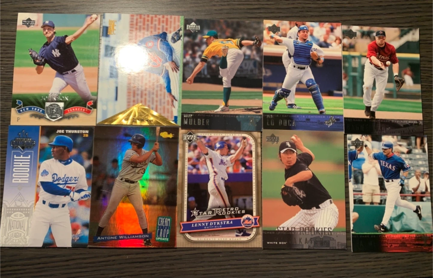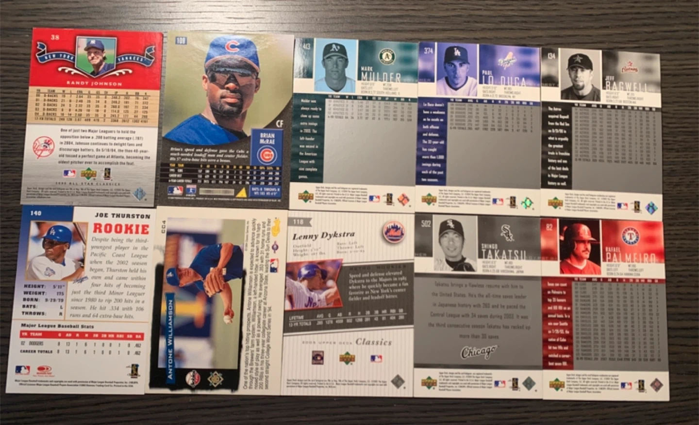Selling a lot of vintage baseball cards. These cards feature players like Randy Johnson, Brian Giles, Mark Mulder, Raul Mondesi, Jeff Bagwell, Joe Thurston, Antone Williamson, Lenny Dykstra, Shingo Takatsu, and Rafael Palmeiro. Great for collectors!
