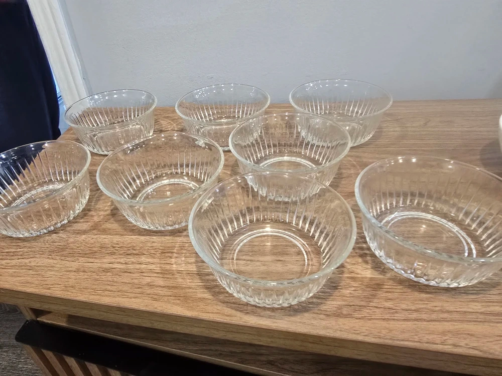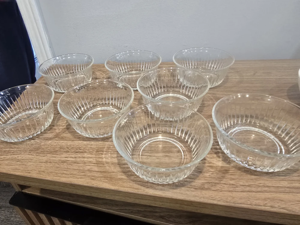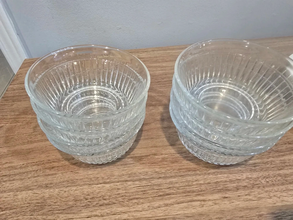 Selling a set of 8 clear glass bowls. They're in great condition and perfect for serving snacks or desserts. The bowls feature a simple yet elegant design with vertical ridges on the outside. They're a great addition to any kitchen!