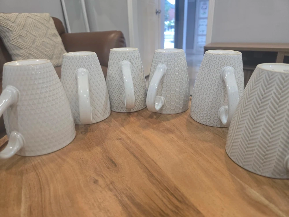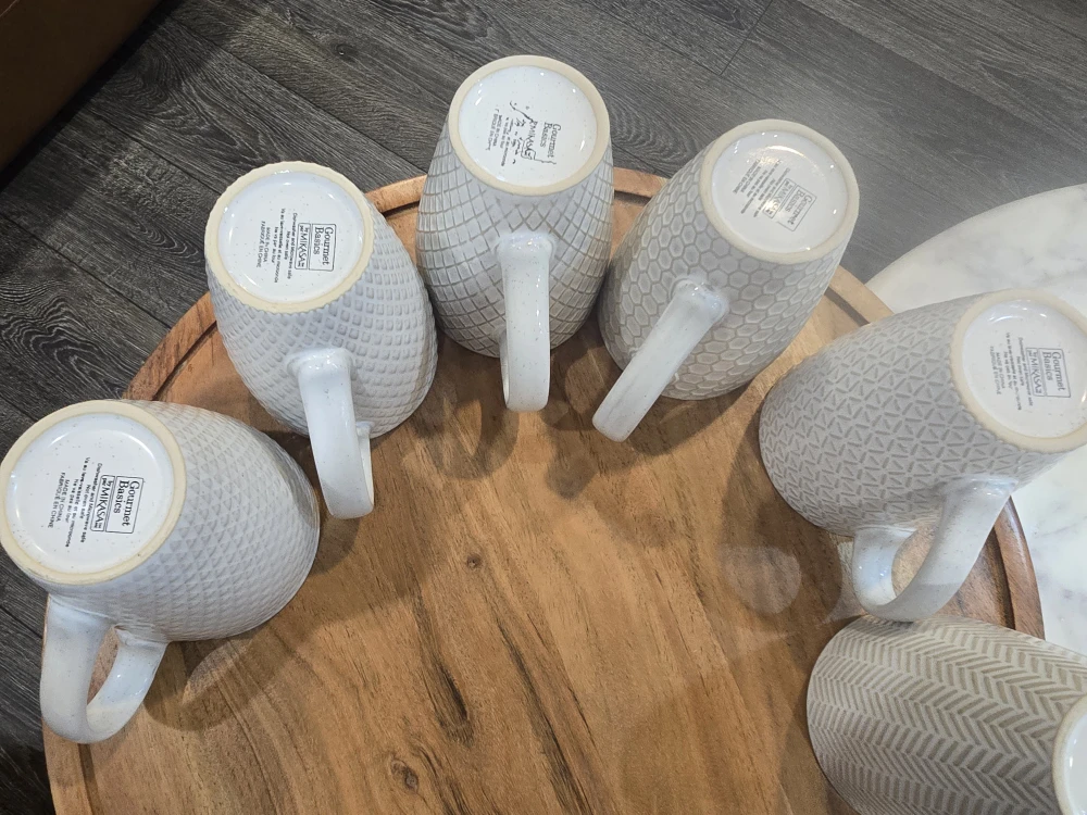 Selling a set of six Gourmet Home Products mugs! They're all white with different textured patterns. Perfect for enjoying your morning coffee or tea!