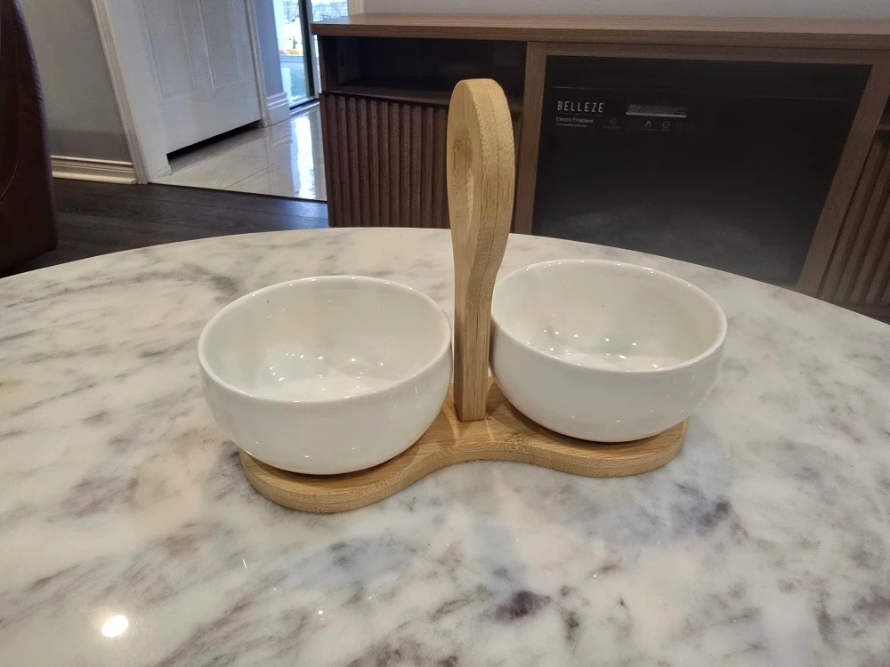 Selling a set of two white ceramic bowls with a cute bamboo stand and spoon. It's perfect for serving dips, snacks, or condiments at your next gathering. The bowls are in great condition and ready to add a touch of elegance to your table!
