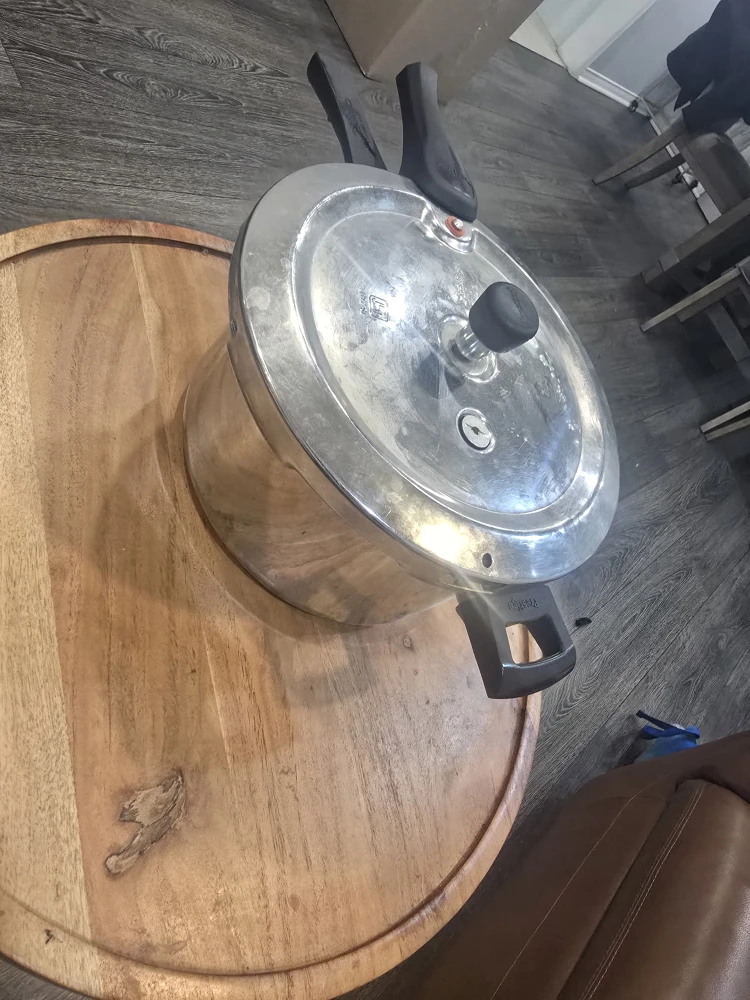 Selling a used pressure cooker, made of stainless steel. It's in good condition and ready for your kitchen! It has a black handle and lid, and is perfect for making quick and easy meals.