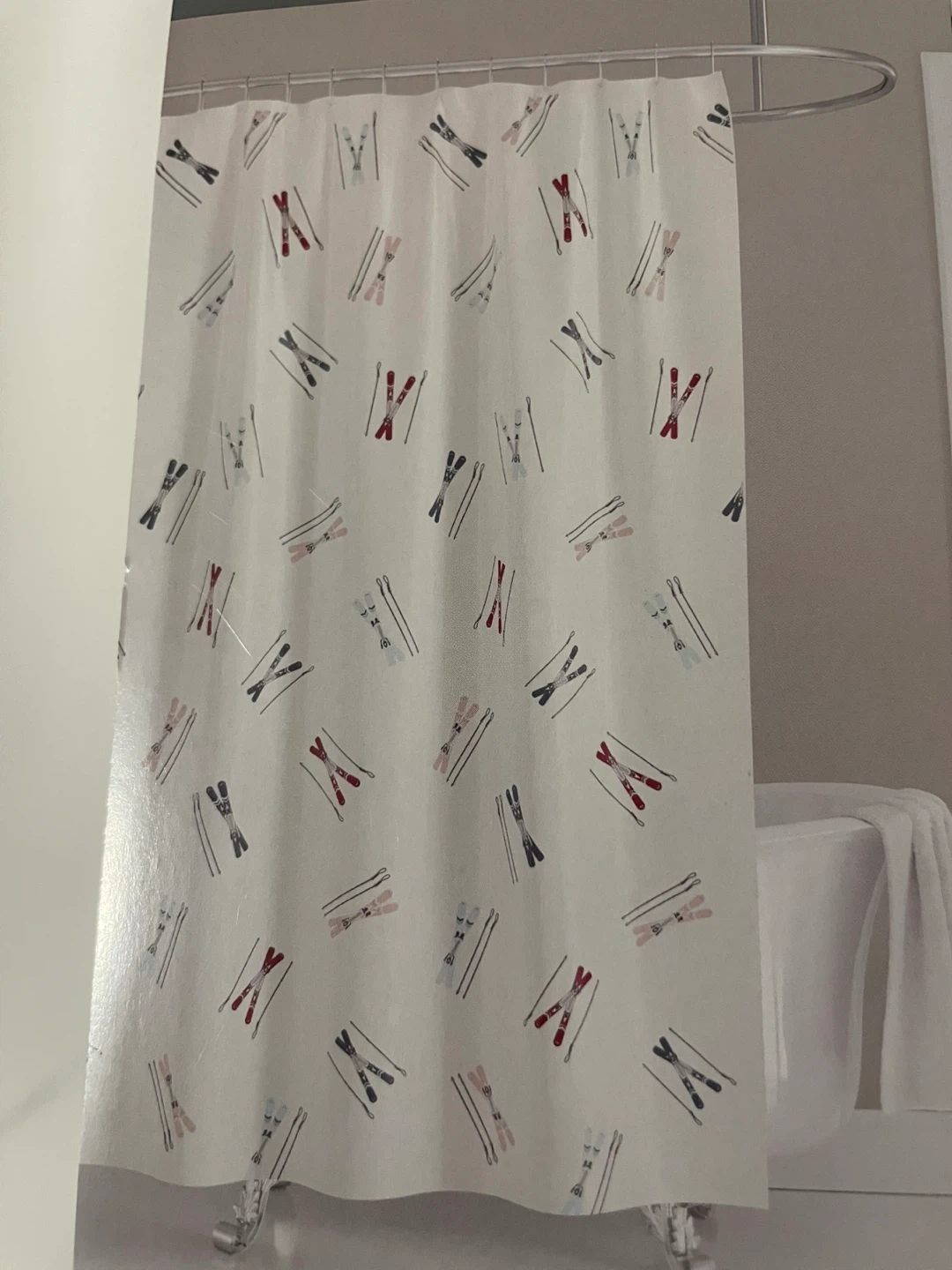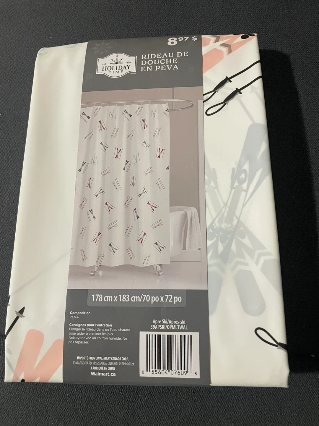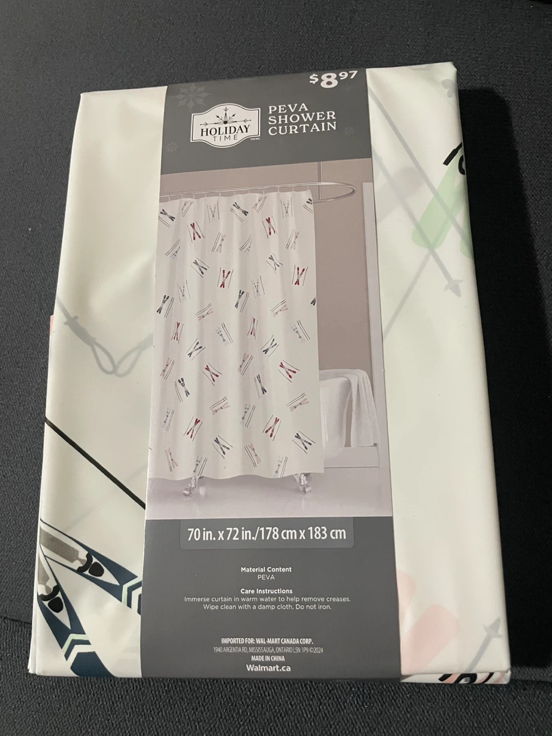 Selling a brand new Holiday Time PEVA shower curtain! It's 70 inches by 72 inches (178 cm x 183 cm). The material content is PEVA. This shower curtain features a fun ski-themed design