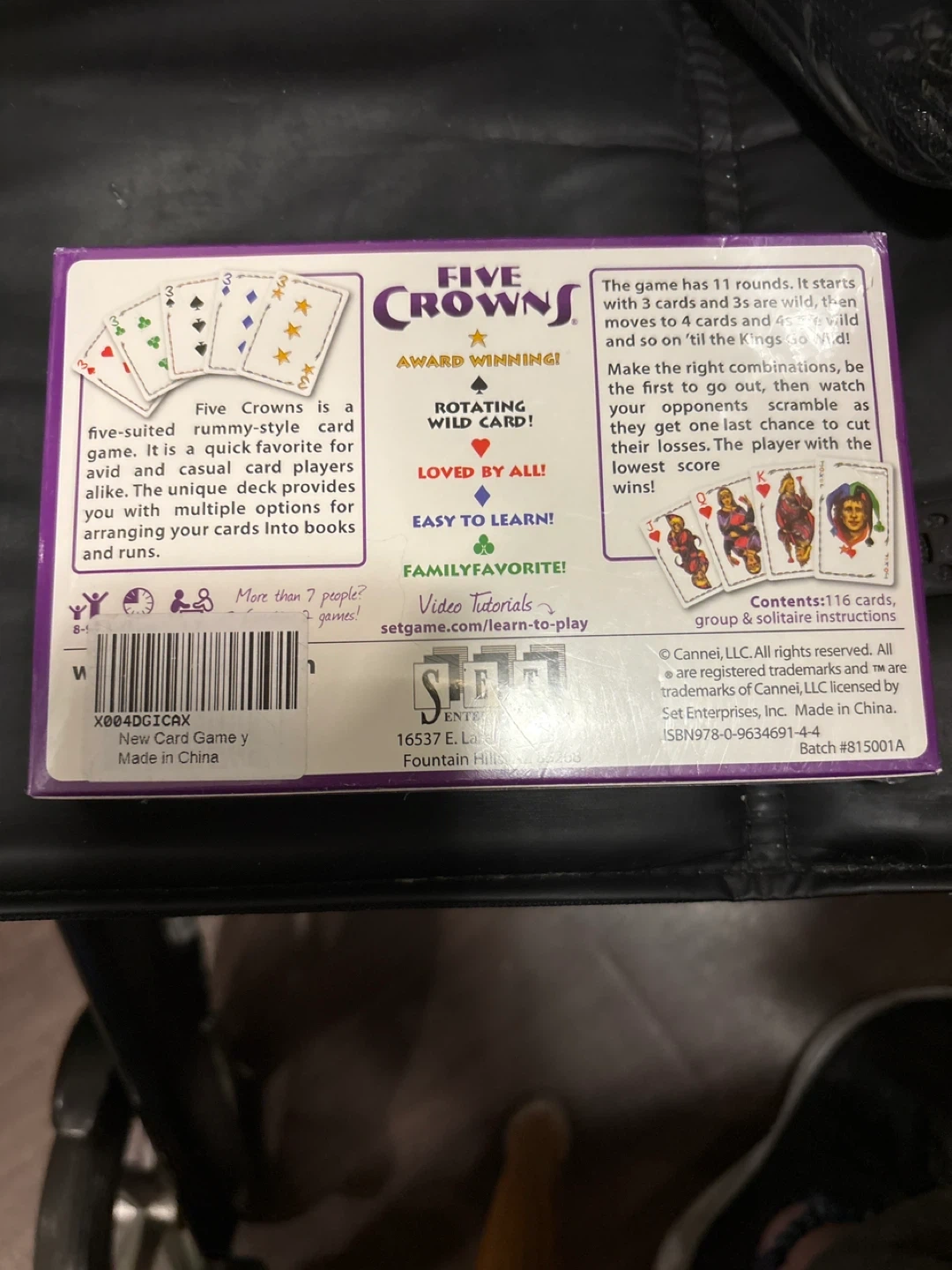 New in sealed box a Five Crowns card game! It's a quick favourite for avid and casual card players alike. The unique deck provides you with multiple options for arranging your cards into books and runs. Includes 116 cards for group and solitaire instructions. Makes a great gift for any occasion.