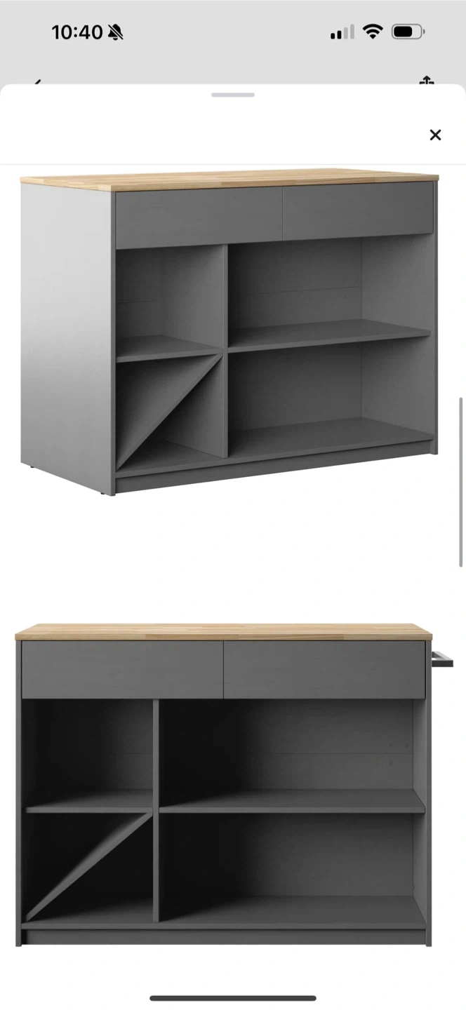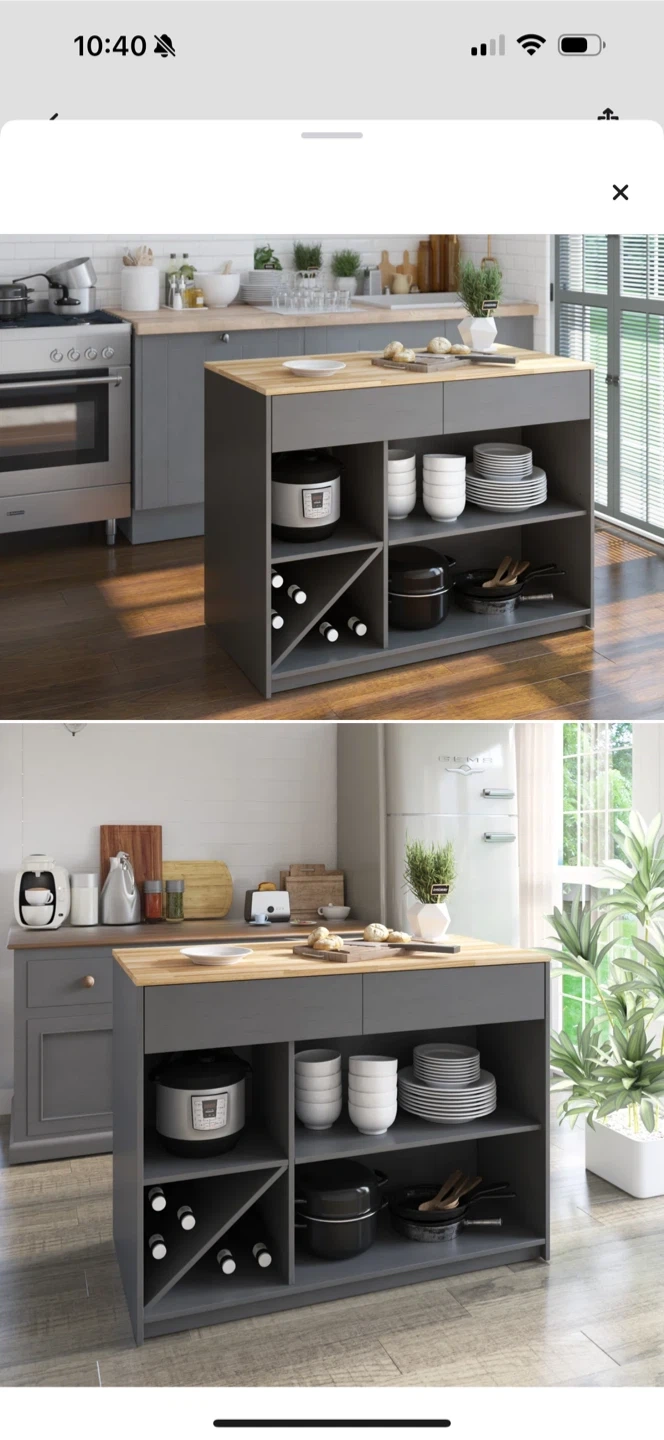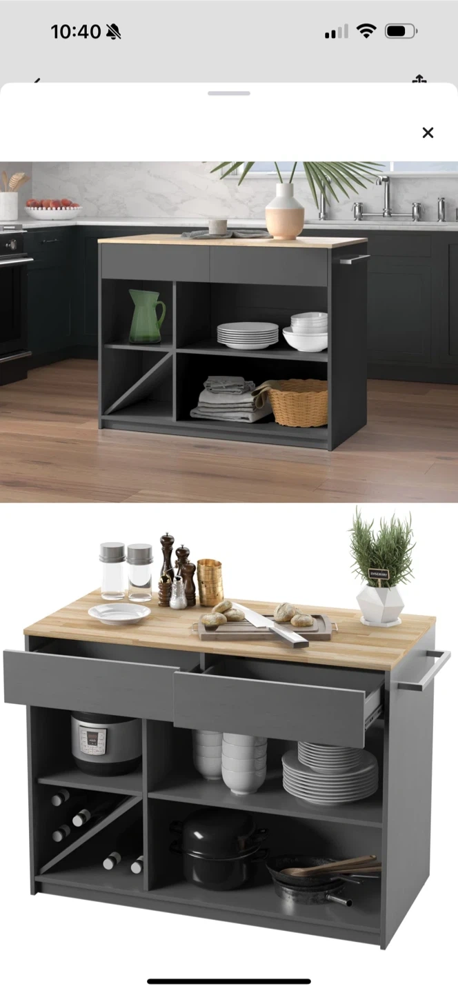 This kitchen island is perfect for adding extra storage and counter space to your kitchen! It features a grey finish with a wooden countertop. There are shelves for storing dishes, pots, and pans, as well as a wine rack on one side. It also has a drawer for utensils or other small items. It's in great condition and ready for a new home! We are moving out and new space doesn’t need this!!
