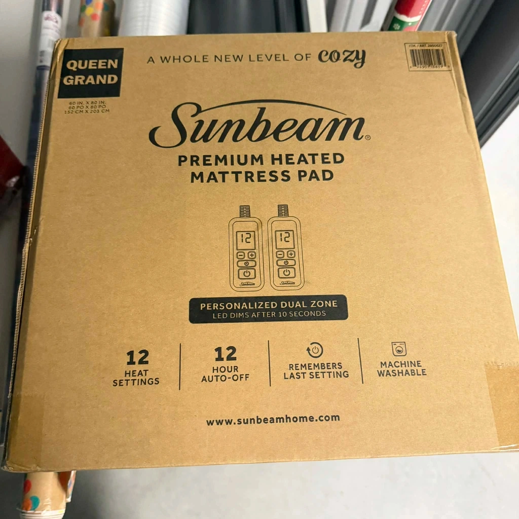 Selling a Sunbeam Premium Heated Mattress Pad in Queen size! It's designed with a personalized dual zone and the LED dims after 10 seconds.