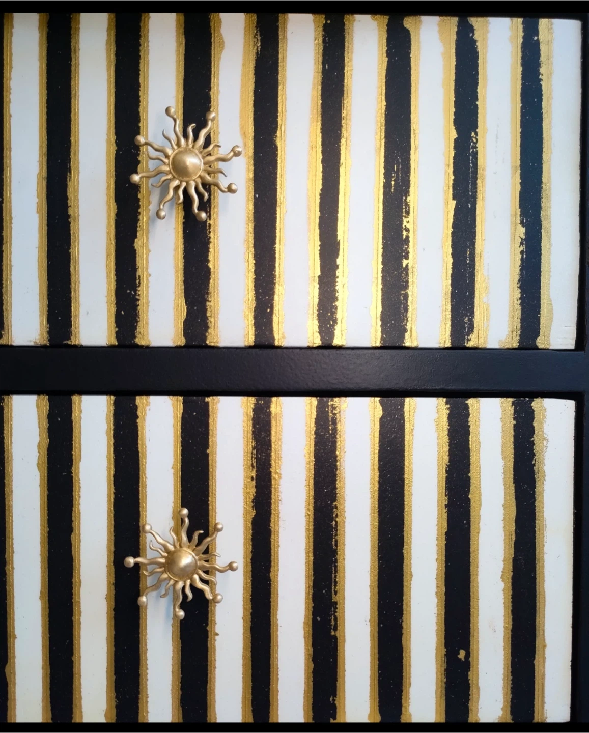 This dresser has a unique design with black paint, gold accents, and striped drawers. The drawer pulls are a gold sunburst design. The inside of the drawers are lined with a black and white floral pattern. It's a great accent piece!