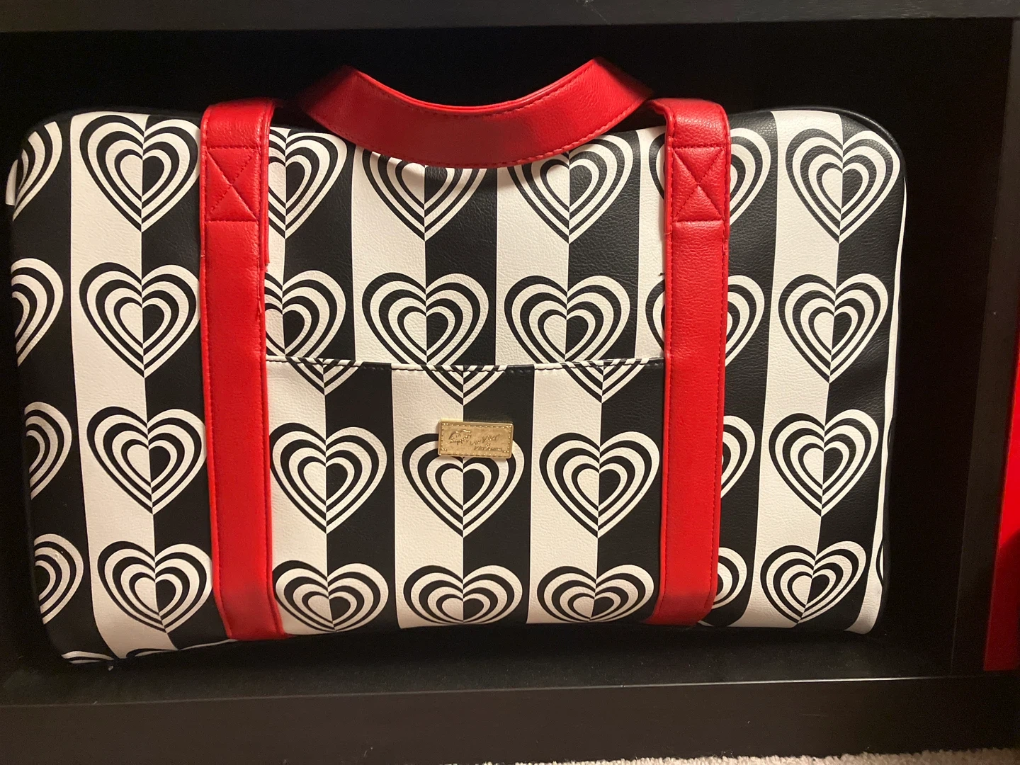Check out this Betsey Johnson duffle bag! It features a vibrant and fun black and white heart print with red accents. Perfect for a weekend getaway or a trip to the gym