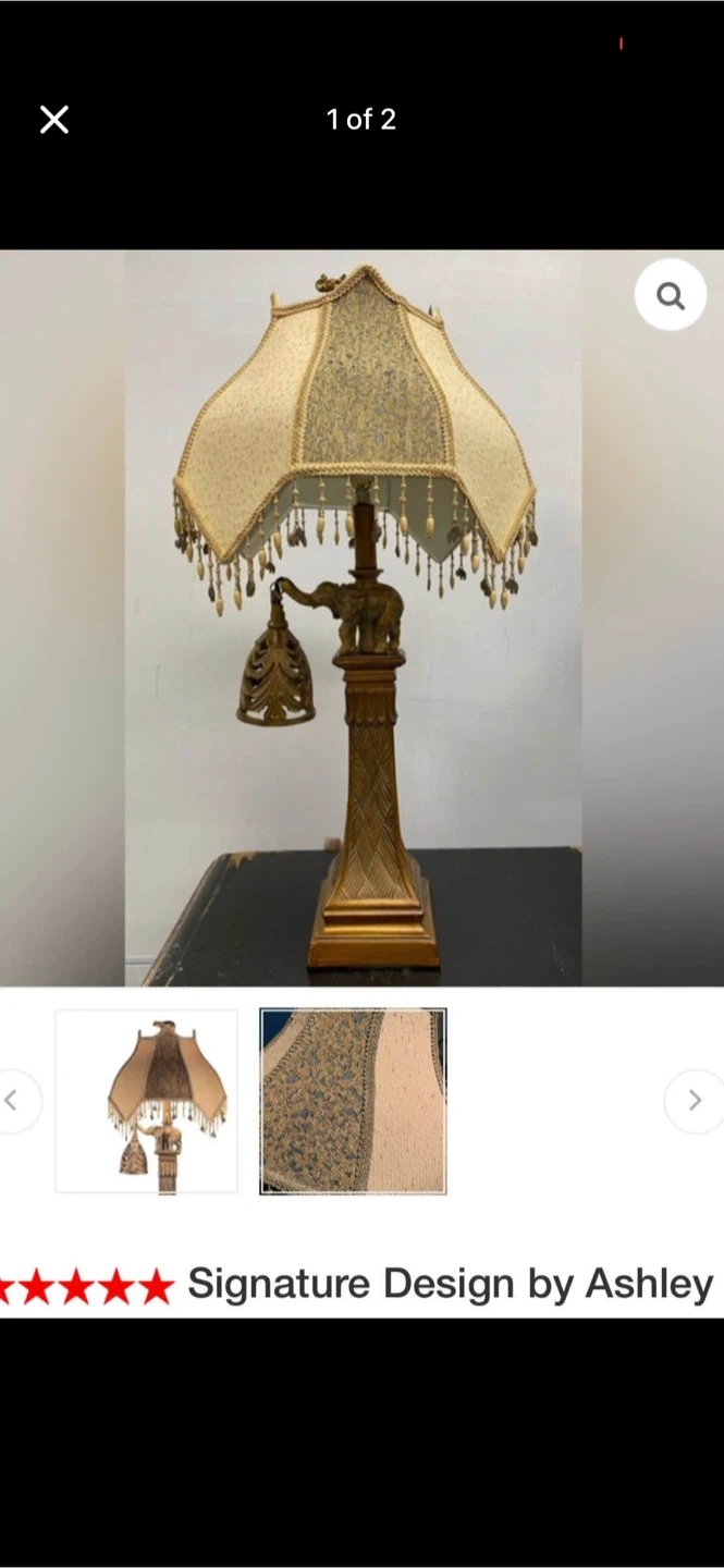 Selling a Signature Design by Ashley table lamp. It features an ornate design with an elephant figure on the base and beaded fringe around the shade. This lamp would add a unique touch to any room!