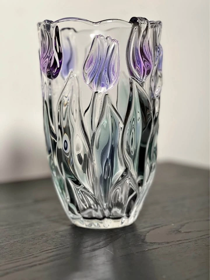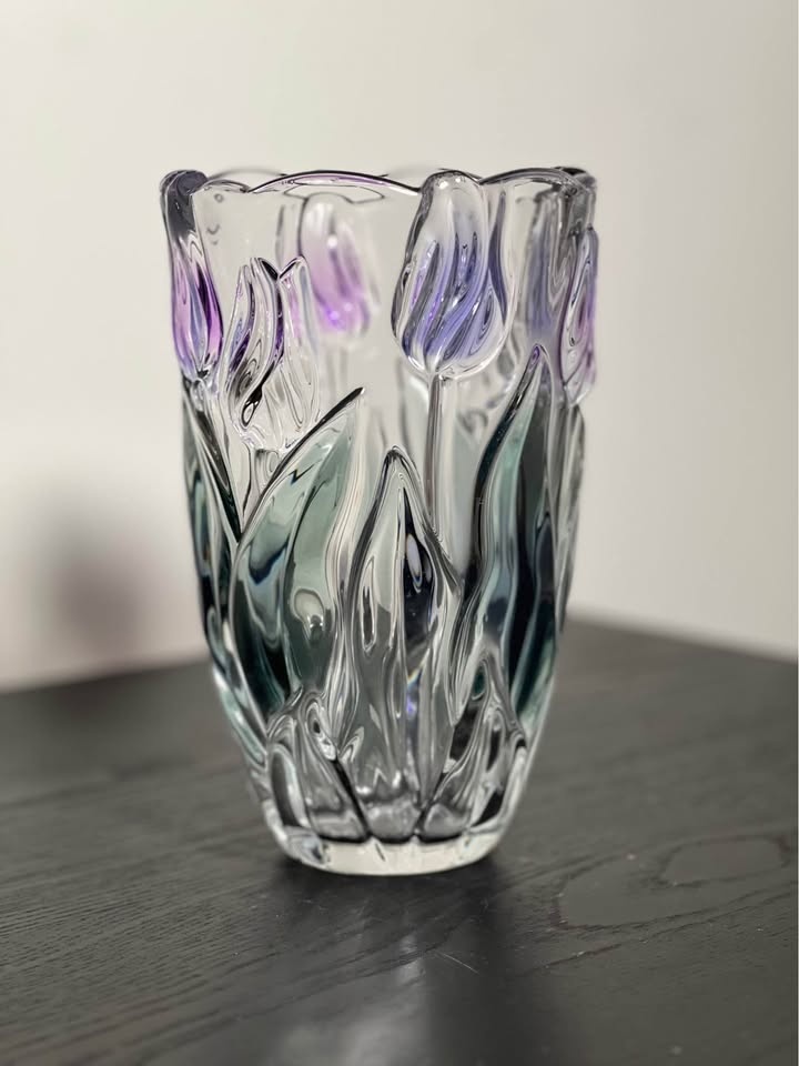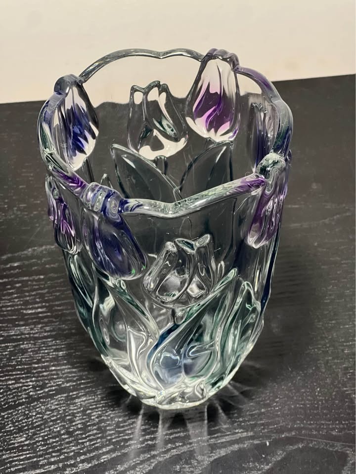 Tivoli Mikasa Spring Debut 8” vase, known for its distinctive embossed design featuring purple and green tulips.