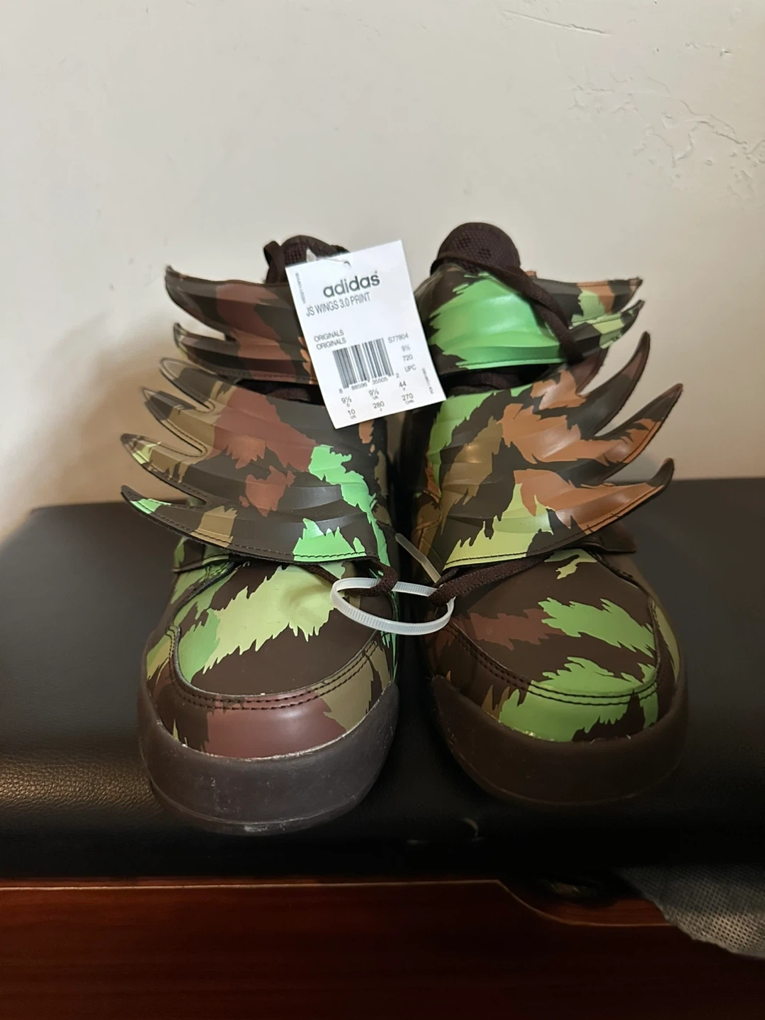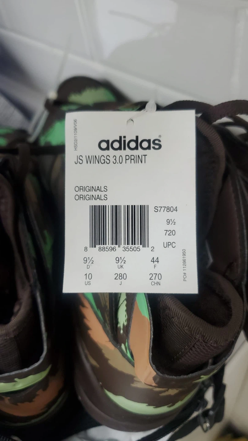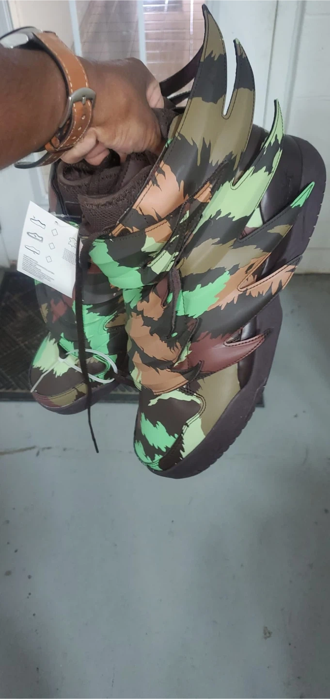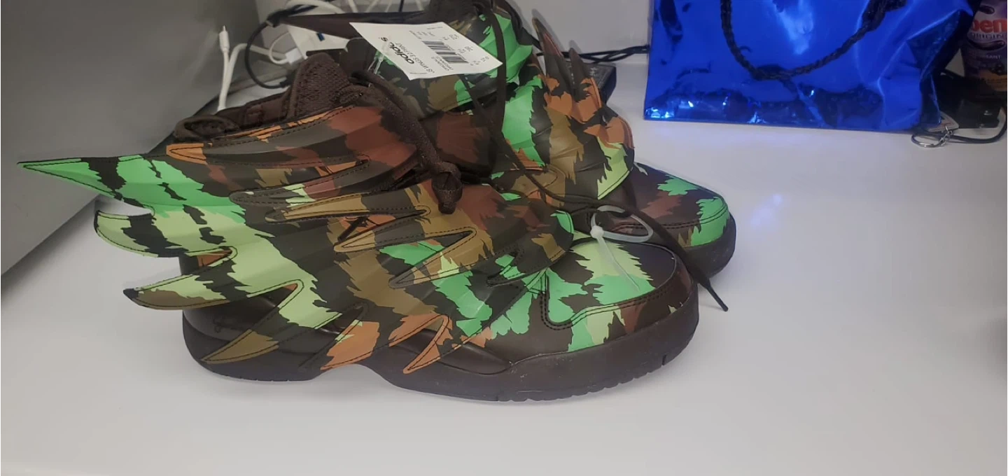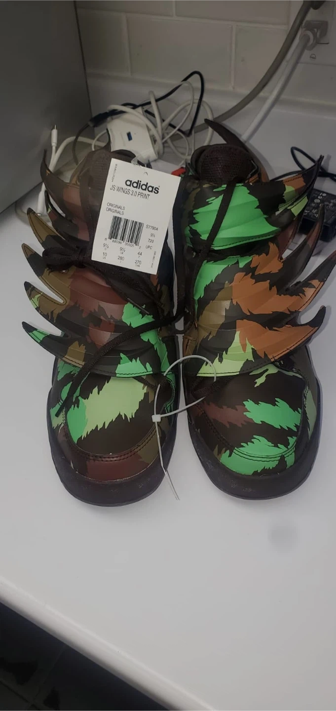 Selling a pair of Adidas Jeremy Scott JS Wings 3.0 Print shoes in a unique camouflage colourway! These shoes are sure to turn heads with their distinctive wing design. They are in brand new and ready for a new owner
