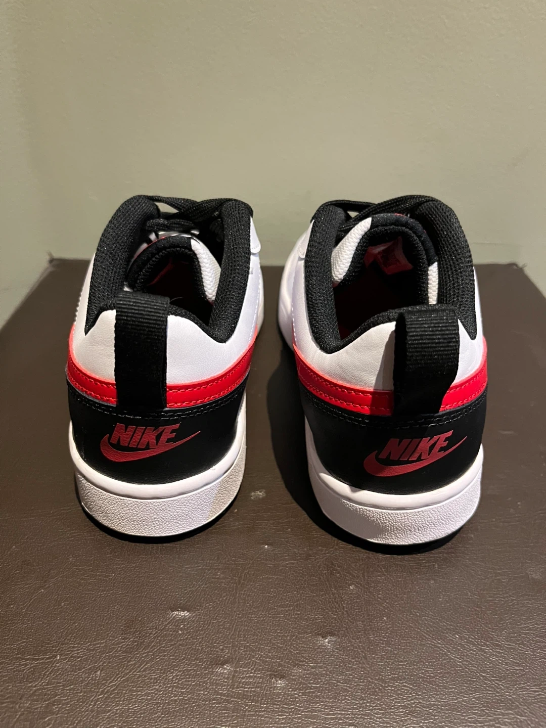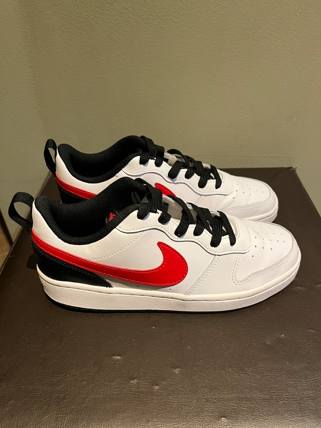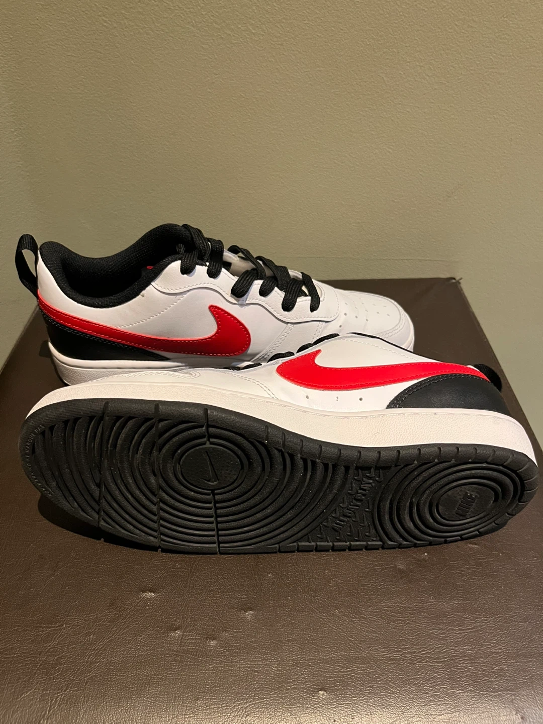 Classic Nike sneakers. White base with bold red accents. Comfortable and stylish.