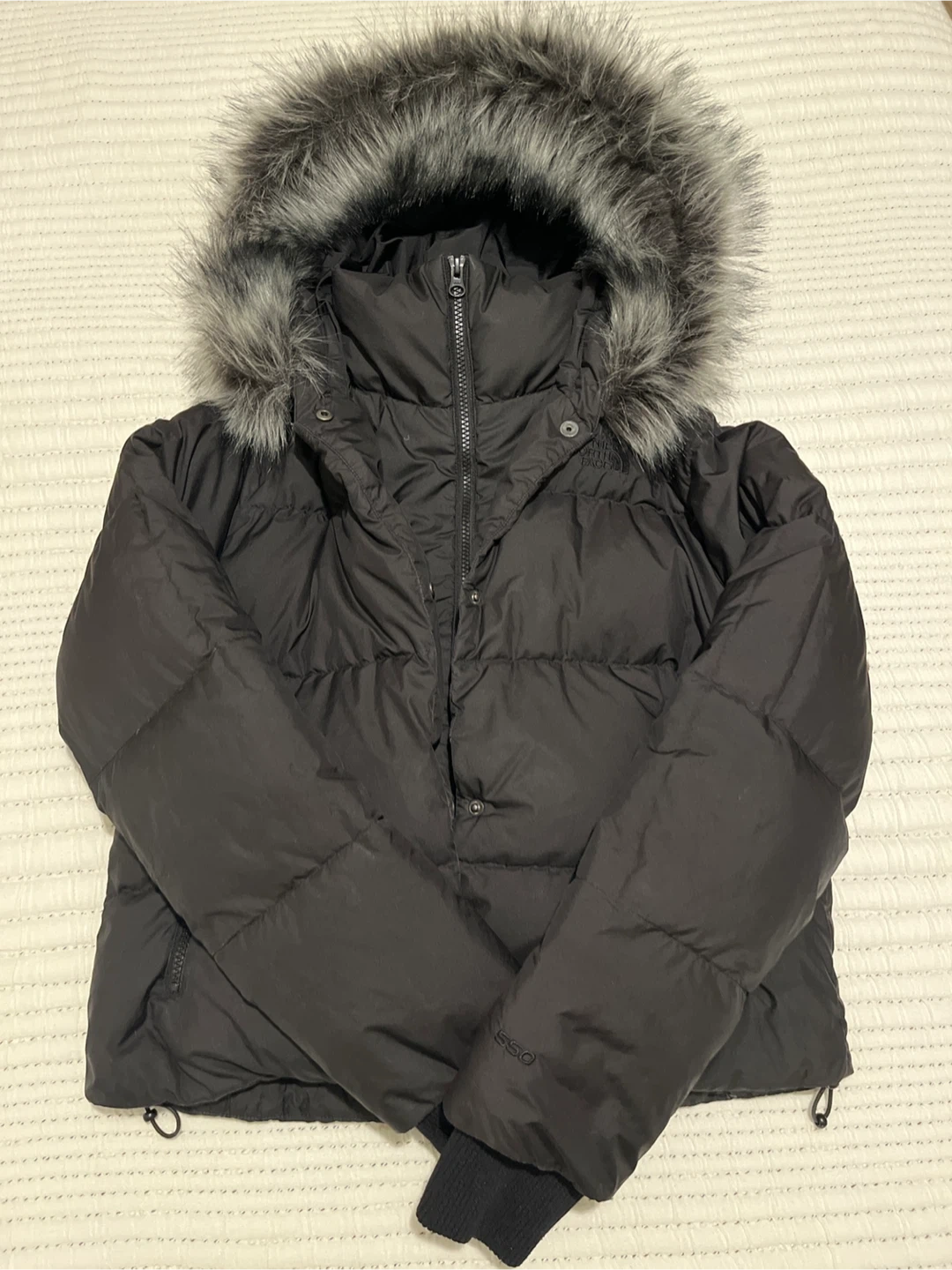 Selling a The North Face puffer jacket in women's size XS. It's black and features a faux fur hood. Perfect for staying warm this winter! XS gloves and one size hat included.