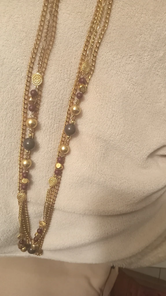 Selling a gold tone layered necklace with brown and gold beads. It's in great condition and is a beautiful statement piece!