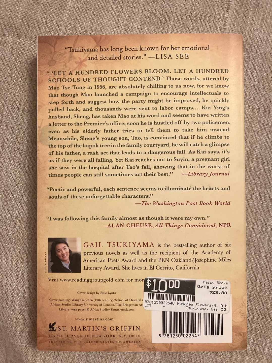 Selling "A Hundred Flowers," a novel by Gail Tsukiyama! It's a captivating read that has been described as 'magical' by The Washington Post Book World. Originally priced at $25.99, this book is perfect for anyone who enjoys emotional and detailed stories.