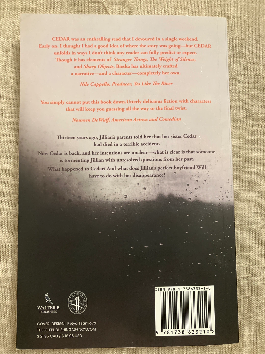 Selling 'Cedar: A Novel' by Katie Biekša! It's a compelling read with elements of suspense and mystery. Perfect for anyone who enjoys a good thriller. The cover design is by Petya Tsankova. Originally priced at $21.95 CAD