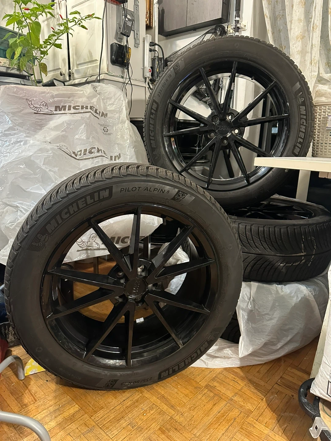 For sale: Michelin Pilot Alpin 4 winter tires. The size is 235/50 R19. They are black rim and have a snowflake symbol on them, indicating they are suitable for winter conditions only 1season used like new.