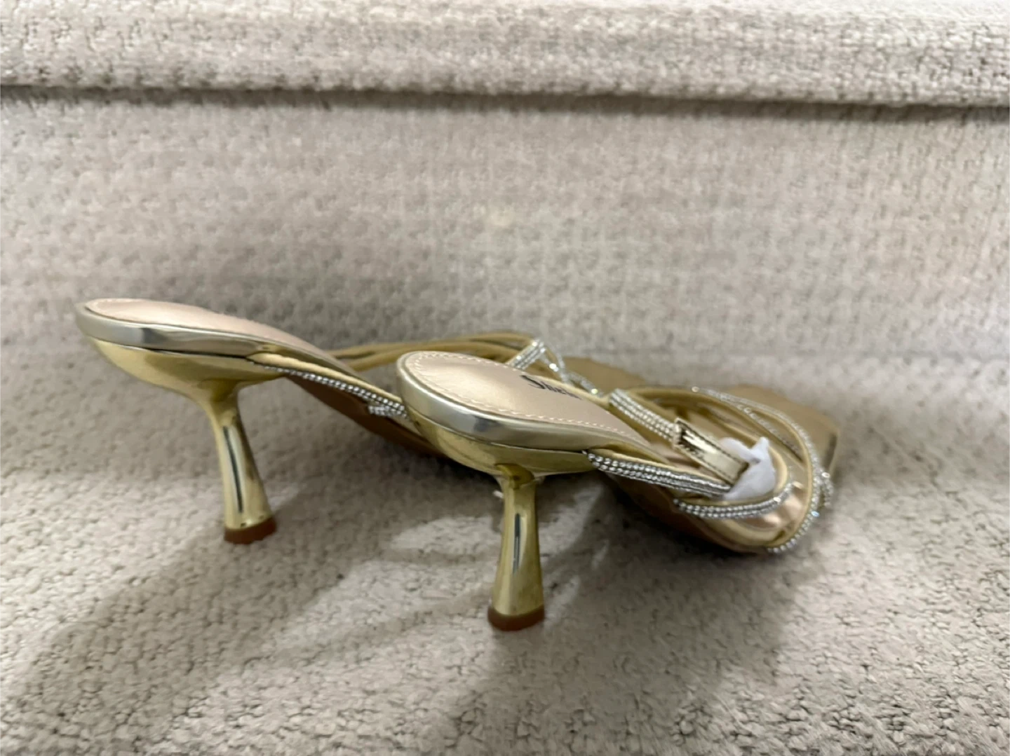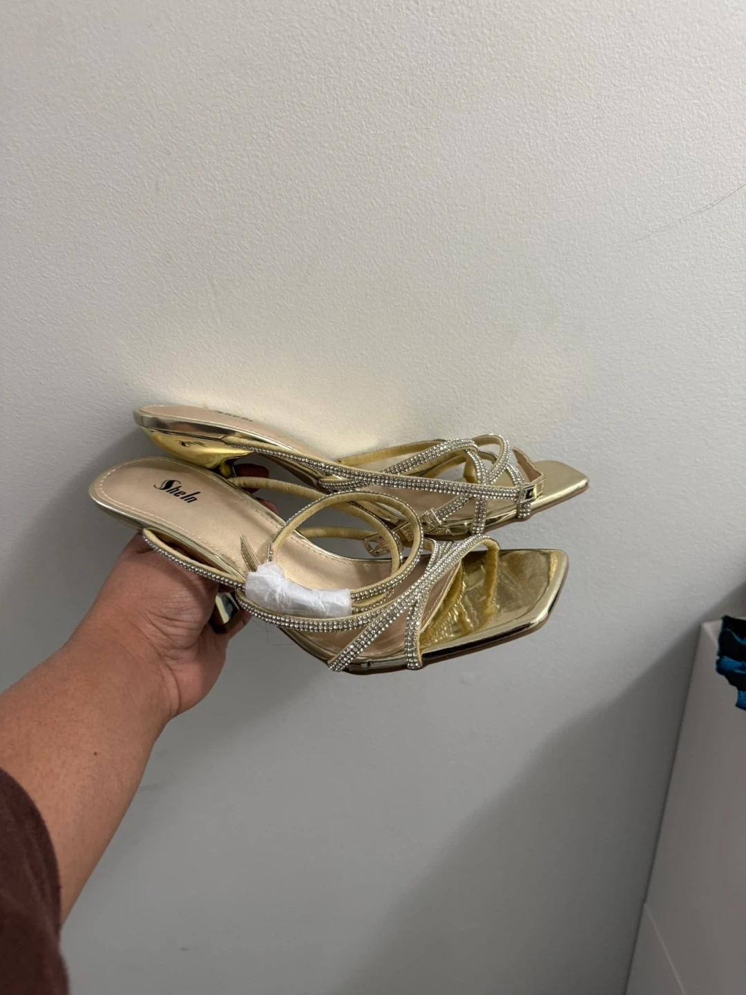 Brand new pair of gold tie up heels from SheIn in a size 7. They feature a strappy design with rhinestone detailing, perfect for adding a touch of sparkle to any outfit