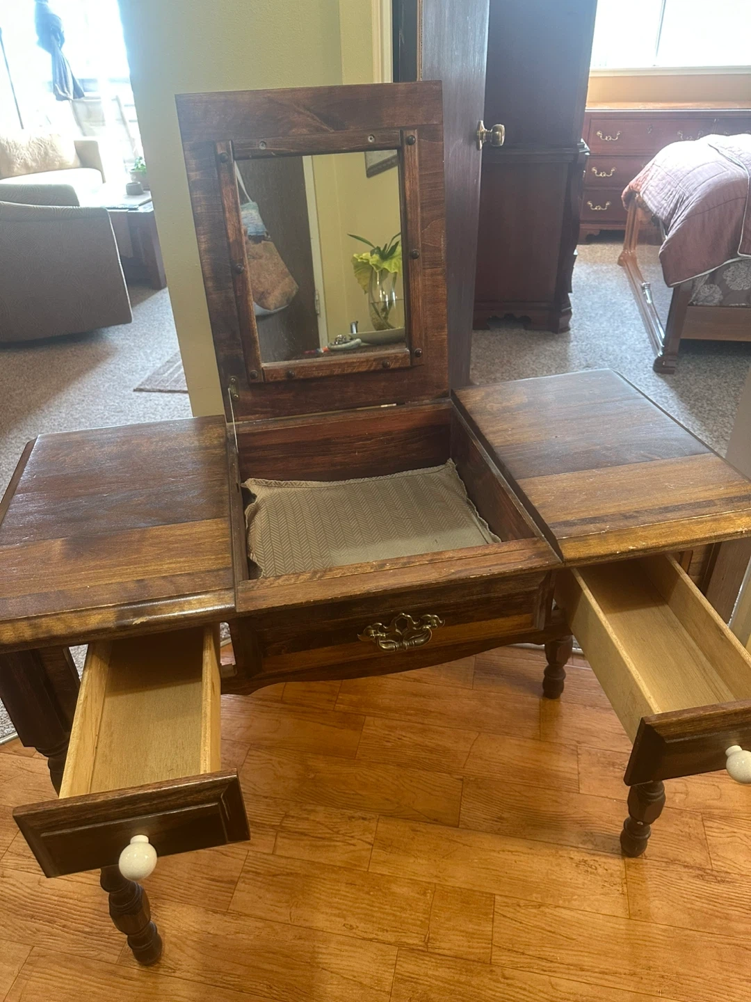 Selling a vintage wooden vanity table that would look great in any bedroom or dressing area! It features a built-in mirror and drawers for storage. It shows some signs of wear, but it's still in good condition and ready for a new home!
