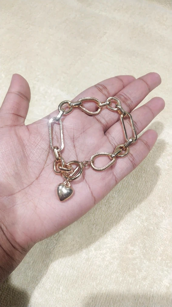 Selling a lovely gold-toned bracelet with a heart charm. It features a toggle clasp and a mix of different shaped links for a unique look. It's in great condition and ready to add a touch of sparkle to your outfit!