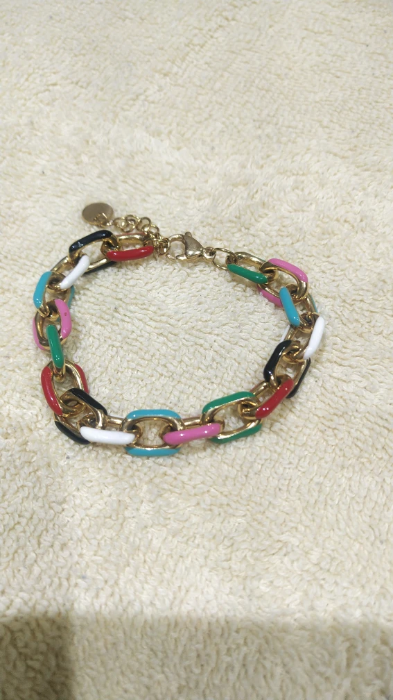 This is a fun and colourful chain bracelet! It features gold-tone links with enamel in various colours. It's perfect for adding a pop of colour to any outfit