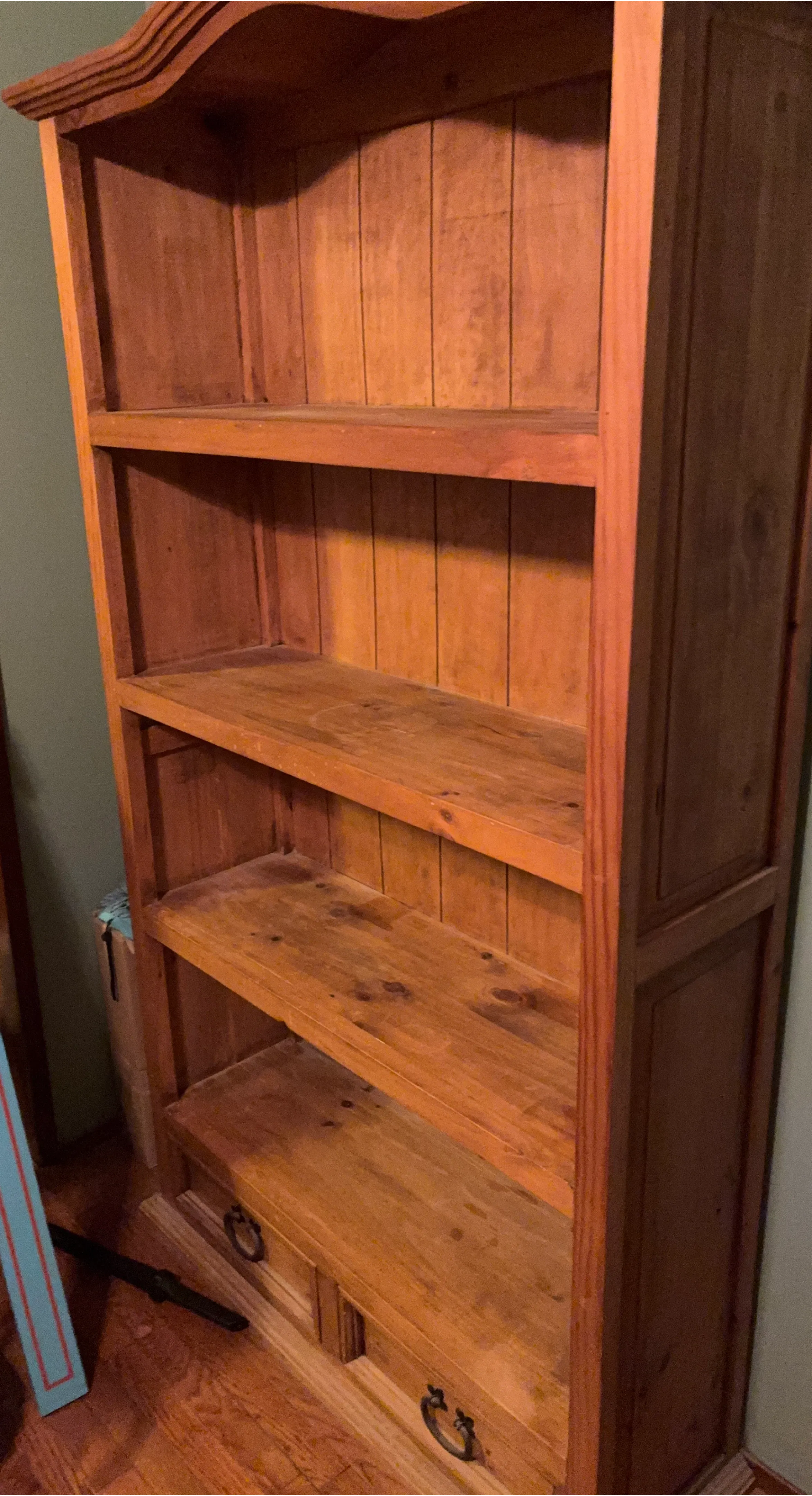 Selling a wooden bookcase with drawers at the bottom. It has a classic design and would be great for displaying books or other items. It's in good condition and ready for a new home!